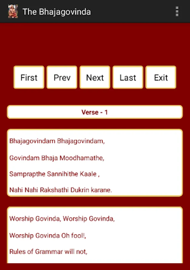 There is a story associated with this hymn. It is said that one day Adi Shankara was walking along the streets of Varanasi with his disciples. He heard a very old scholar teaching the rules of Sanskrit grammar to his students. Taking pity on him, Shankara advised him to not waste time on the rules of grammar at this old age but to turn his mind to God in worship and devotion. The Bhajagovindam was said to be composed on this occassion.