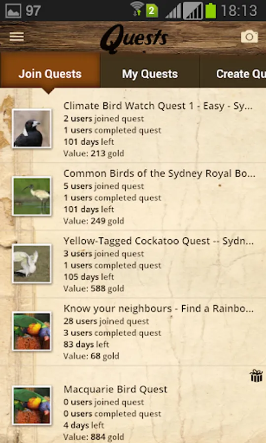 QuestaGame takes you outdoors - to your backyard, a local park, a hiking trail, anywhere - for you to discover, learn about, and help monitor biodiversity. Join quests and compete with other players to photograph animals and plants in the wild and ultimately help create a sustainable future.