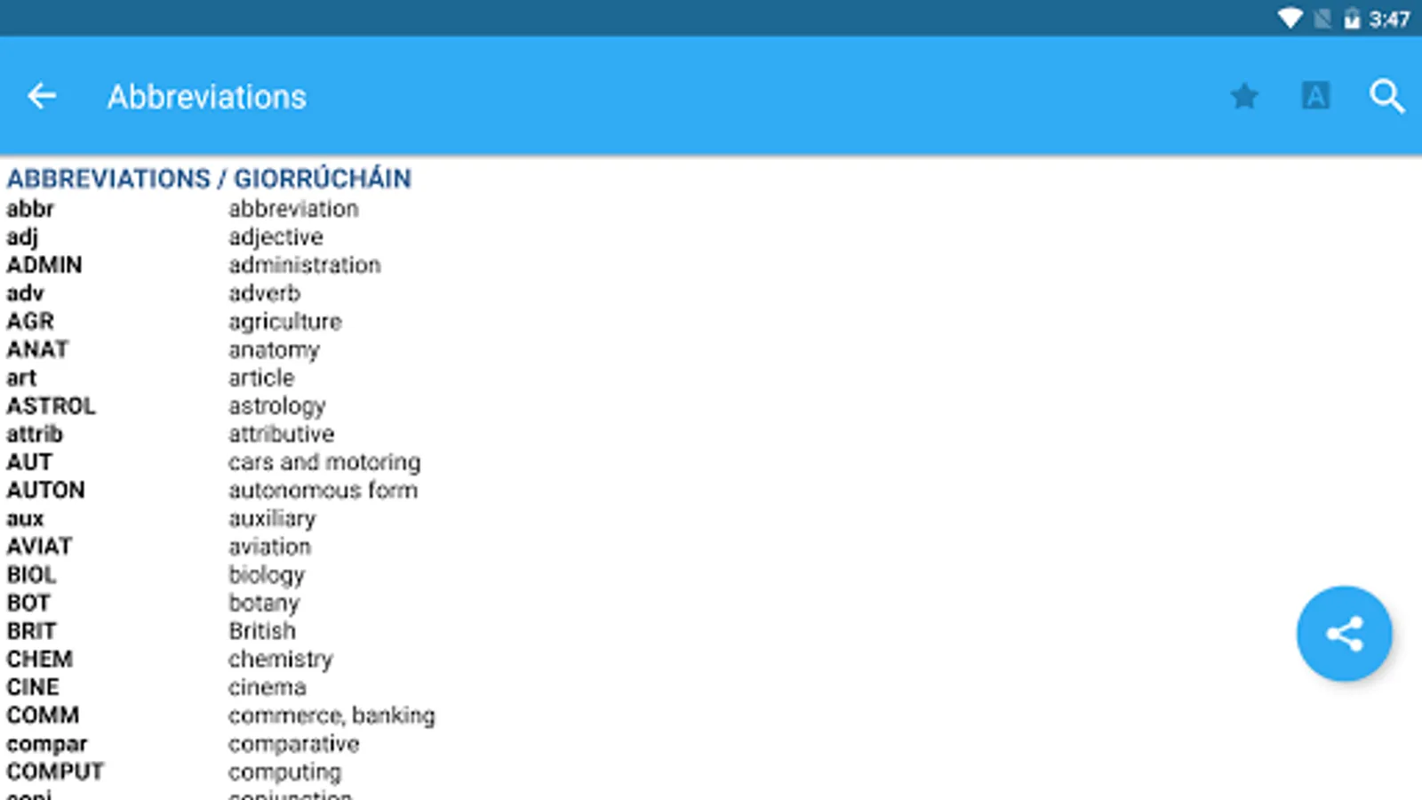 In this language dictionary app, you can search for Irish and English words using autocomplete, voice, or camera search features. Includes synonyms, example phrases, and offline access options.