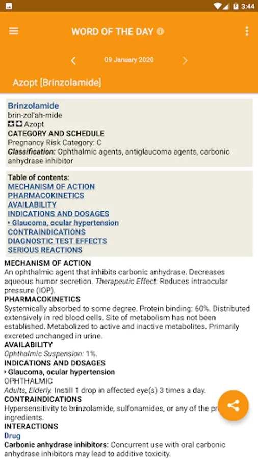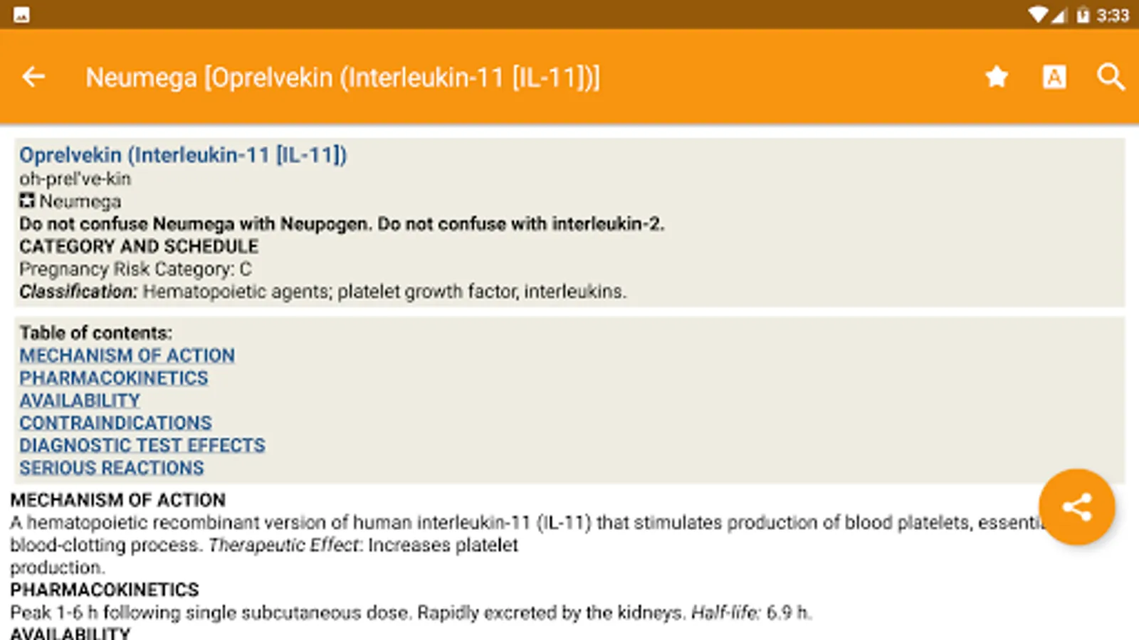 * Monograph sections include: drug name, pronunciation, trade name(s), category and schedule, classification, mechanism of action, pharmacokinetics, availability, indications and dosages, contraindications, interactions (drug, herbal, and food), diagnostic test effects, side effects, serious reactions, and precautions and considerations.
