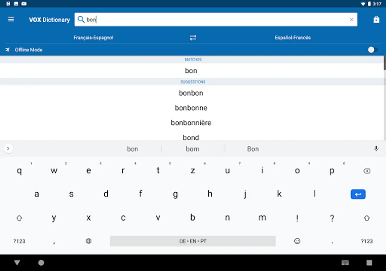 • Search autocomplete helps find words quickly by displaying predictions as you type