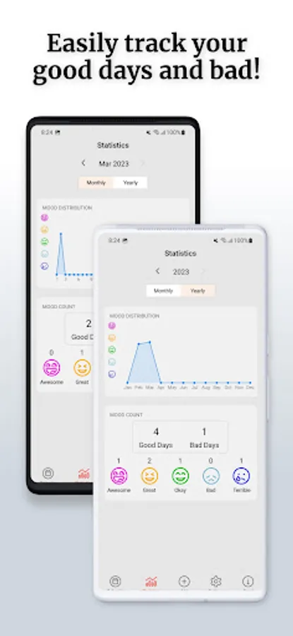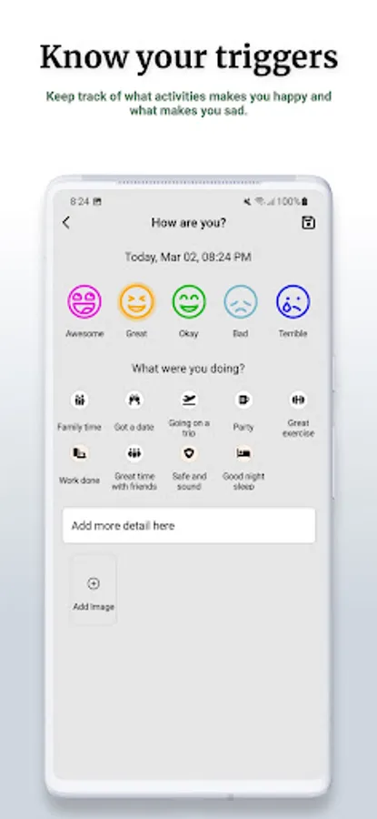 MoodMate is a perfect tool in order to keep track of your emotions by keeping a private journal. The key to managing stress and unwelcome thoughts is to be aware of the activities, places, events or individual/s that make you happy or unhappy.