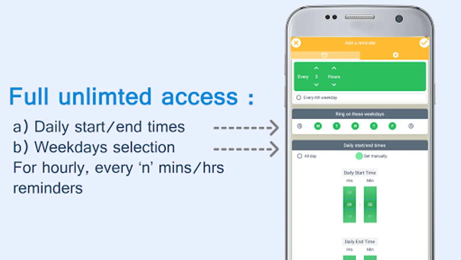 1. Daily start/end times, weekdays selection for Hourly & every "n" mins/hrs reminders.