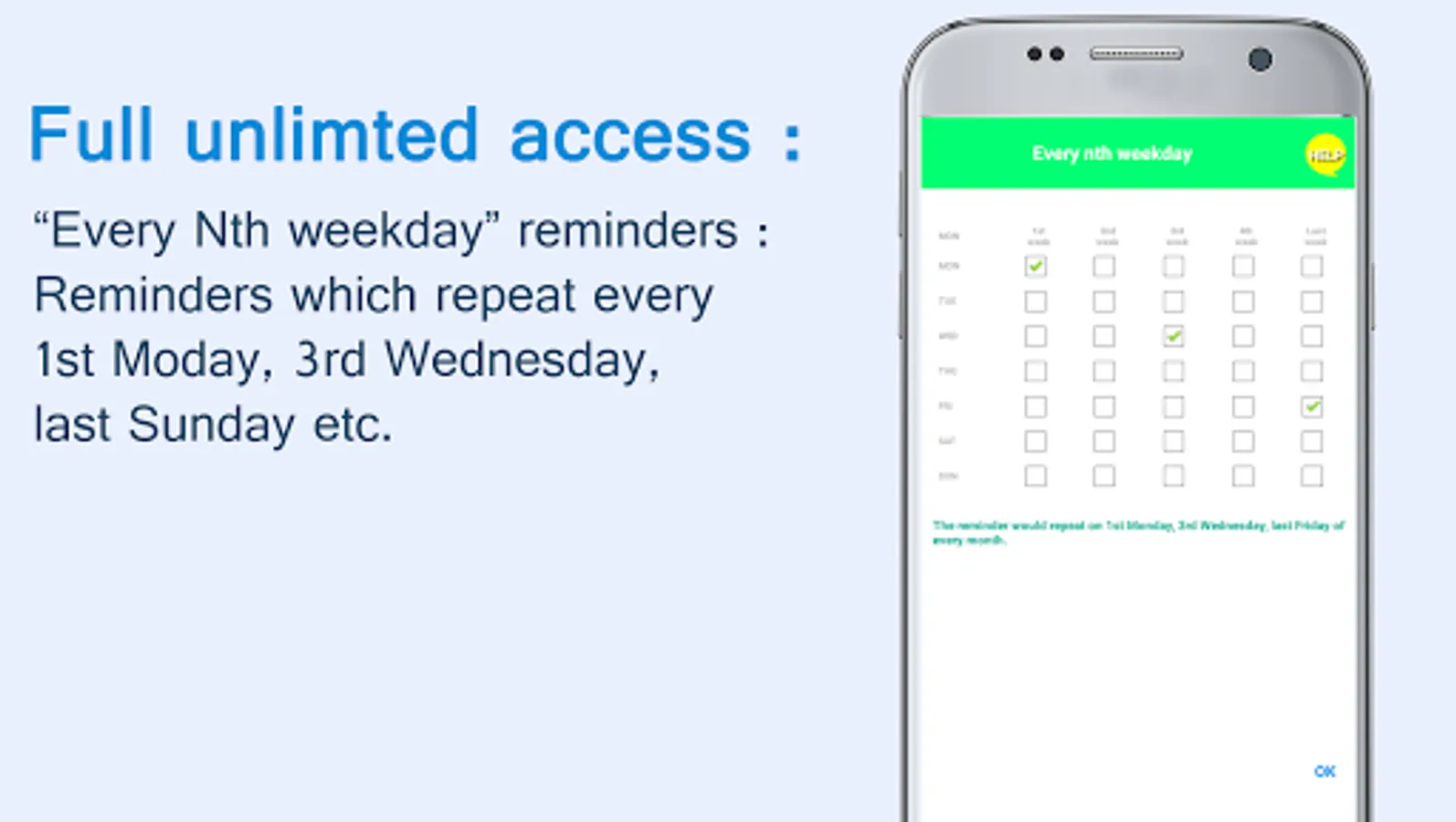 3. "Every Nth weekday" reminders : Reminders which repeat every 1st Monday, 3rd Wednesday, last Sunday etc.