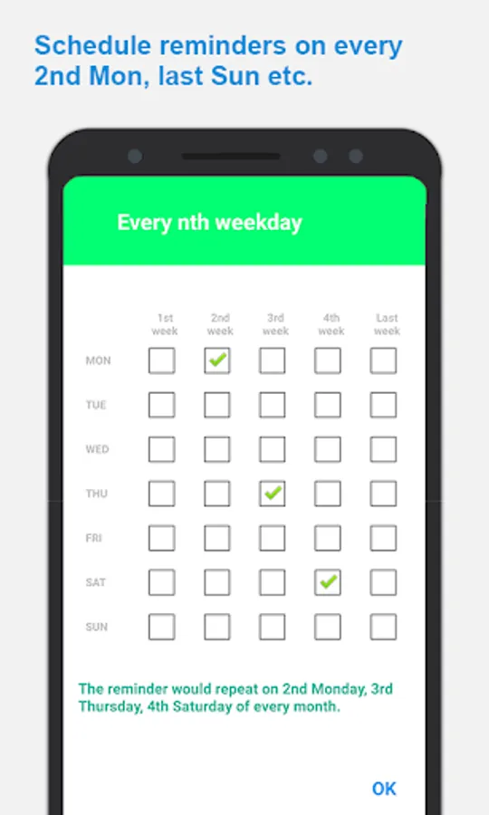 3. Reminders repeating on Days of week i.e. Mon/Tue/Wed/Thur etc