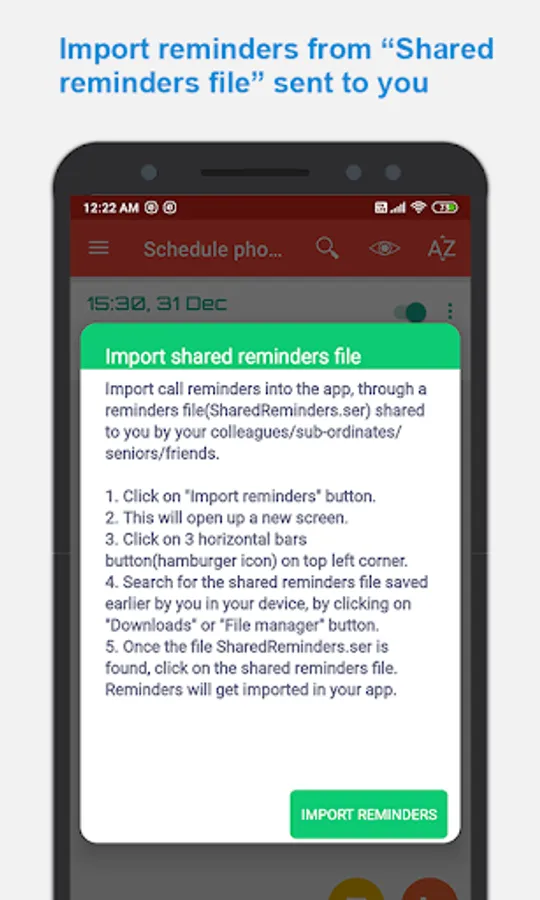• Share & import phone call reminders: You can share phone call reminders with team members, sub-ordinates, seniors, family, friends etc through a "shared reminders" file using email, whatsapp etc.