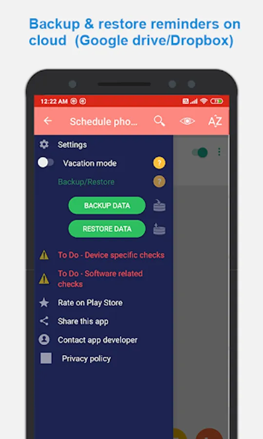 • Backup/restore data on cloud: Backup & restore reminders on Google Drive/Dropbox/OneDrive, ensuring seamless migration to a new device. Or if you have multiple devices, backup data on one device & restore/copy on any number of other devices.