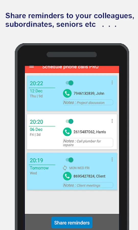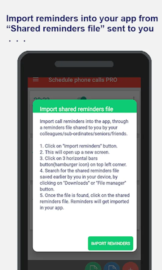 • Share & import phone call reminders: You can share phone call reminders to team members, sub-ordinates, seniors, family, friends etc through a "shared reminders" file using email, whatsapp etc.