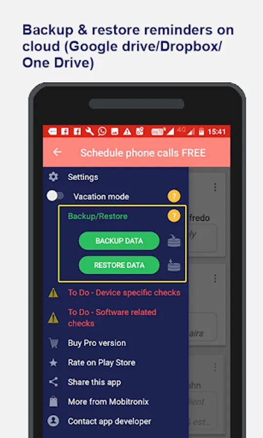• Backup/restore data on cloud: Backup & restore reminders on Google Drive/Dropbox/OneDrive, ensuring seamless migration to a new device. Or if you have multiple devices, backup data on one device & restore/copy on any number of other devices.