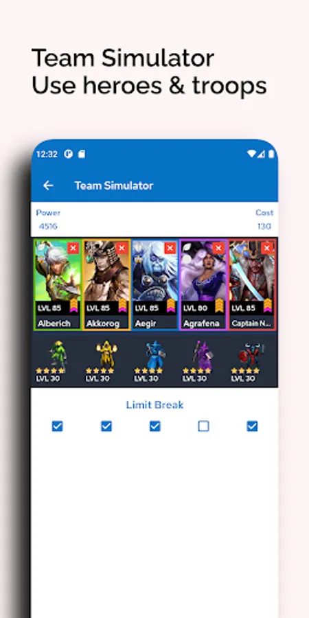 - Simulate any team with troops you want. You can use limit break and emblems.
