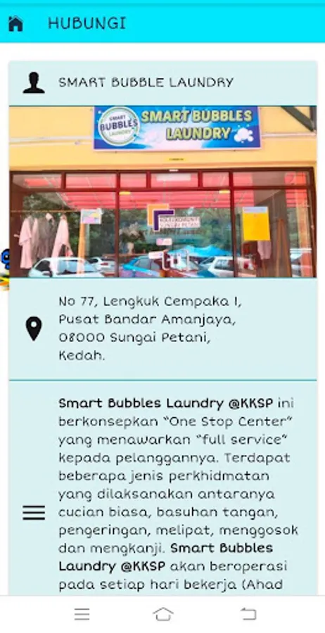 This Smart Bubbles Laundry @KKSP concept is a "One Stop Center" that offers "full service" to its customers. There are several types of services performed such as regular washing, hand washing, drying, folding, rubbing and scrubbing. Smart Bubbles Laundry @KKSP will operate on weekdays (Sundays to Thursdays) from 8.00 am to 5.00 pm.