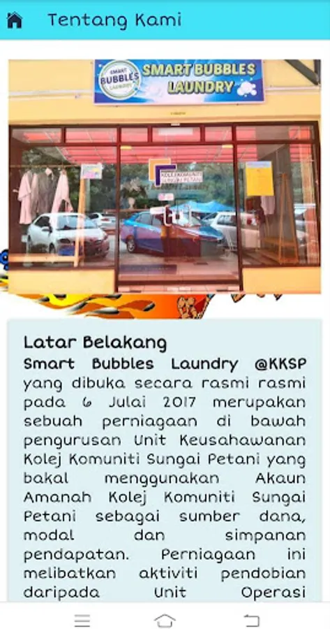 The Smart Bubbles Laundry @KKSP's workforce comprises 4 Lecturers of Hospitality Operations units, KSP students from the Entrepreneurial Club along with two full-time and part-time staff. This is the effort of the Sungai Petani Community College to train students in the management of the laundry business to provide opportunities and opportunities for students to venture into the entrepreneurship business. All service activities, commission payments and profit distribution including inventory management are recorded through the Point of Sales System (POSystem).