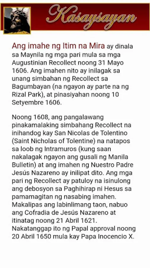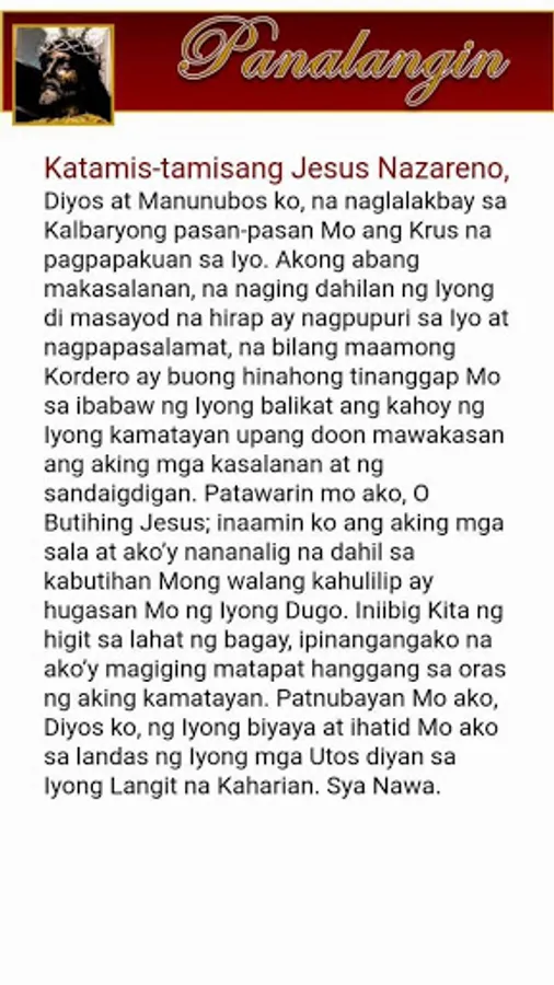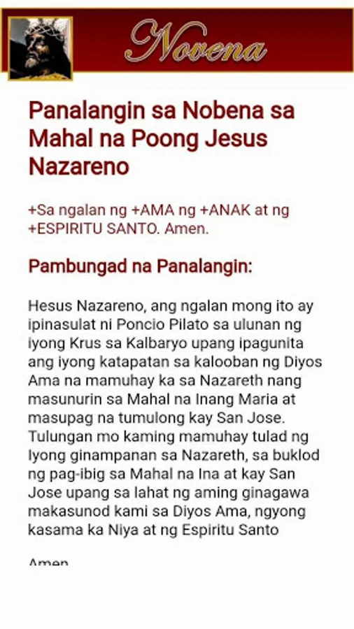 Dasalin natin ang panalangin sa Kanyang novena. Alamin ang kasaysayan ng imahen ng itim na Nazareno. Ibahagi ang app na ito sa mga kapwa deboto.