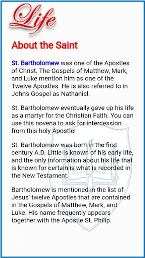 St. Bartholomew is one of the Apostles of Christ. The Gospels of Matthew, Mark, and Luke mention him as one of the Twelve Apostles. He is also referred to in John’s Gospel as Nathaniel.
