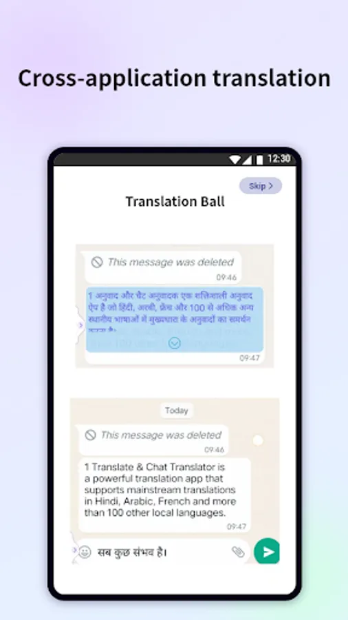 translation translates in any application with a floating ball. Chat without borders, read without barriers.