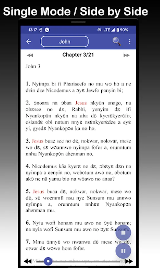 Fante Bible will empower you spiritually through your walk with God. Read in parallel mode (Fante and English side by side) or read in single mode (Fanti or English). Abena can automatically read scriptures to your hearing, scroll verses intelligently read out devotions, daily verses to you. This Fante Holy Bible allows you to highlight, bookmark any part of scriptures, add personal notes, sermons, share scriptures with friends, family on WhatsApp Facebook etc