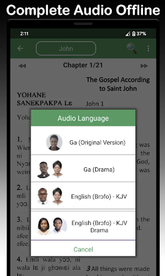 👉 Offline Old & New Testament Audio in Ga, Ga Dangme, Ga Adangbe and English KJV. Audio is completely free and can be listened offline