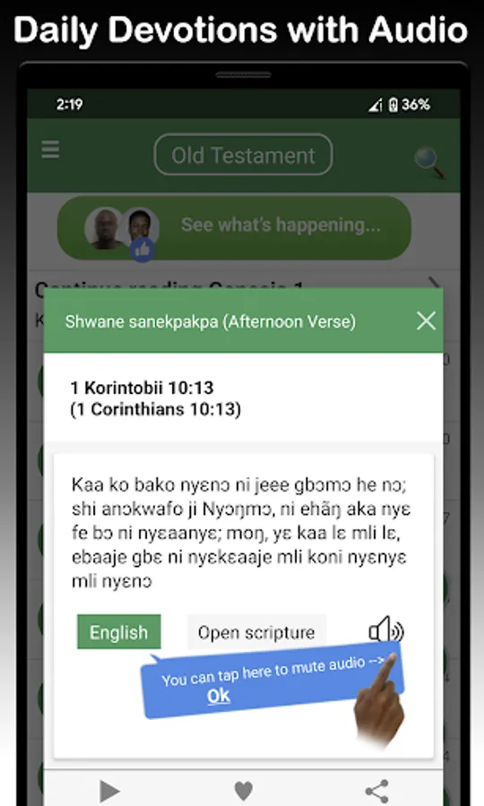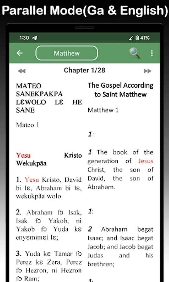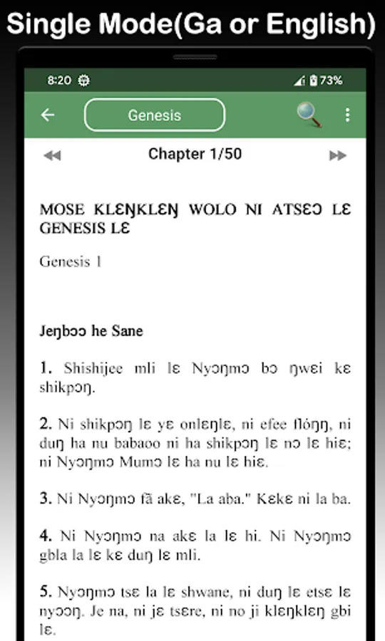 This best Ghanaian app comes with complete offline use and supports text to speech(audio) in the Ghanaian Ga language and KJV. You can read in parallel mode (Ga and English side by side) or read in single mode (Ga or English).