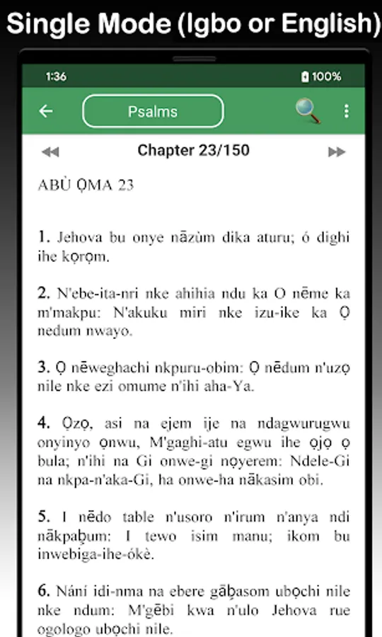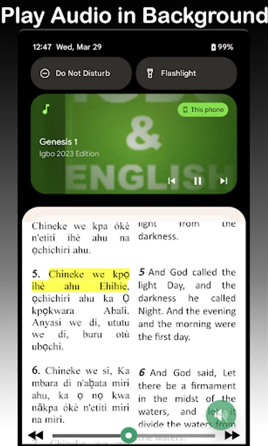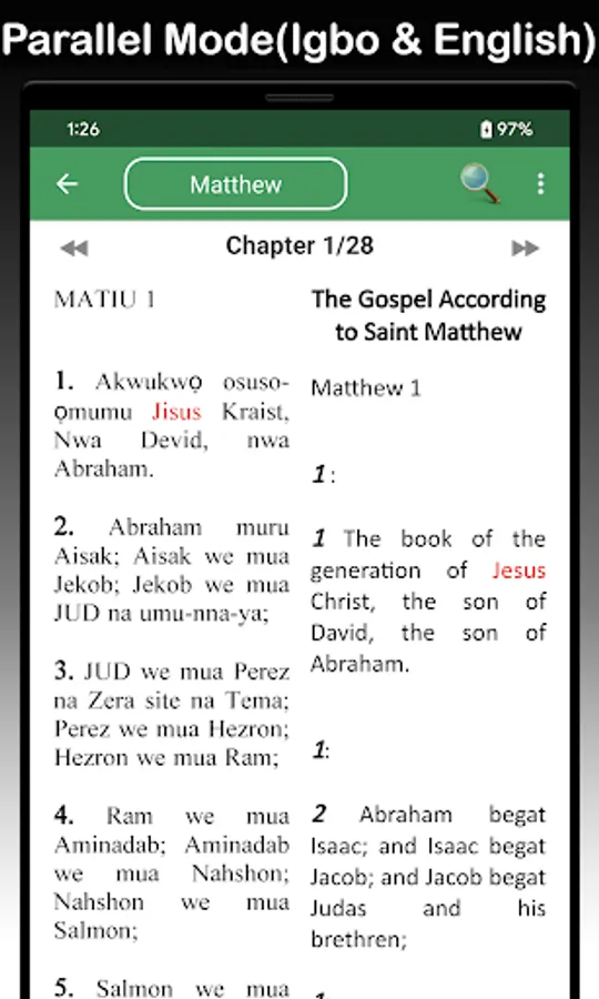 **Read side by side (parallel mode) or switch to single mode between Igbo and English and Pidgin for both Old and New Testaments (Scriptures & audio)