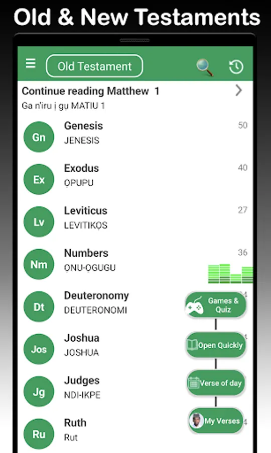 The No.1 Original Igbo Bible with both Igbo and English Bible side by side with full offline audio. An award winning app! A complete Igbo audio bible with Igbo audio, pidgin audio, English bible(KJV), prizes for quizzes etc.