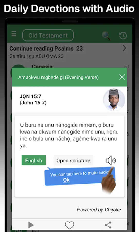 **The only Igbo Bible app with complete offline scriptures, offline audio in Old & New Testaments (all for free) - Full audio in Igbo, Nigerian Pidgin, English