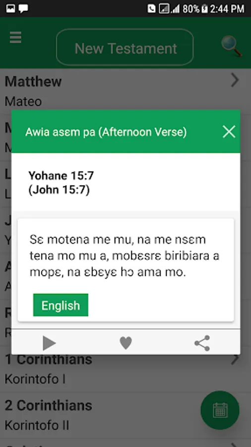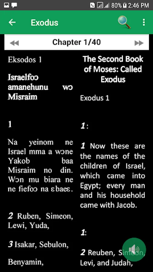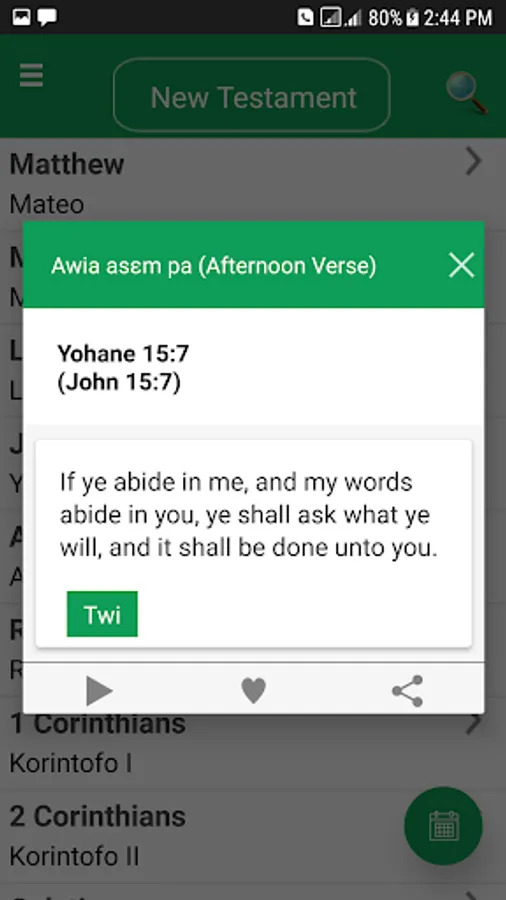 Very lightweight and simple to use Asante Twi Bible and English all in one with free complete audio. Asante Twi - Nkwa asɛm Twerɛ Kronkron, Akuapem, KJV, Akan Akuapem Asante Twi Fante Free. Complete holy bible Nkwa Asem in Twi and English language that talks to you. You can read in day mode, night mode or parallel mode with Twi and English side by side
