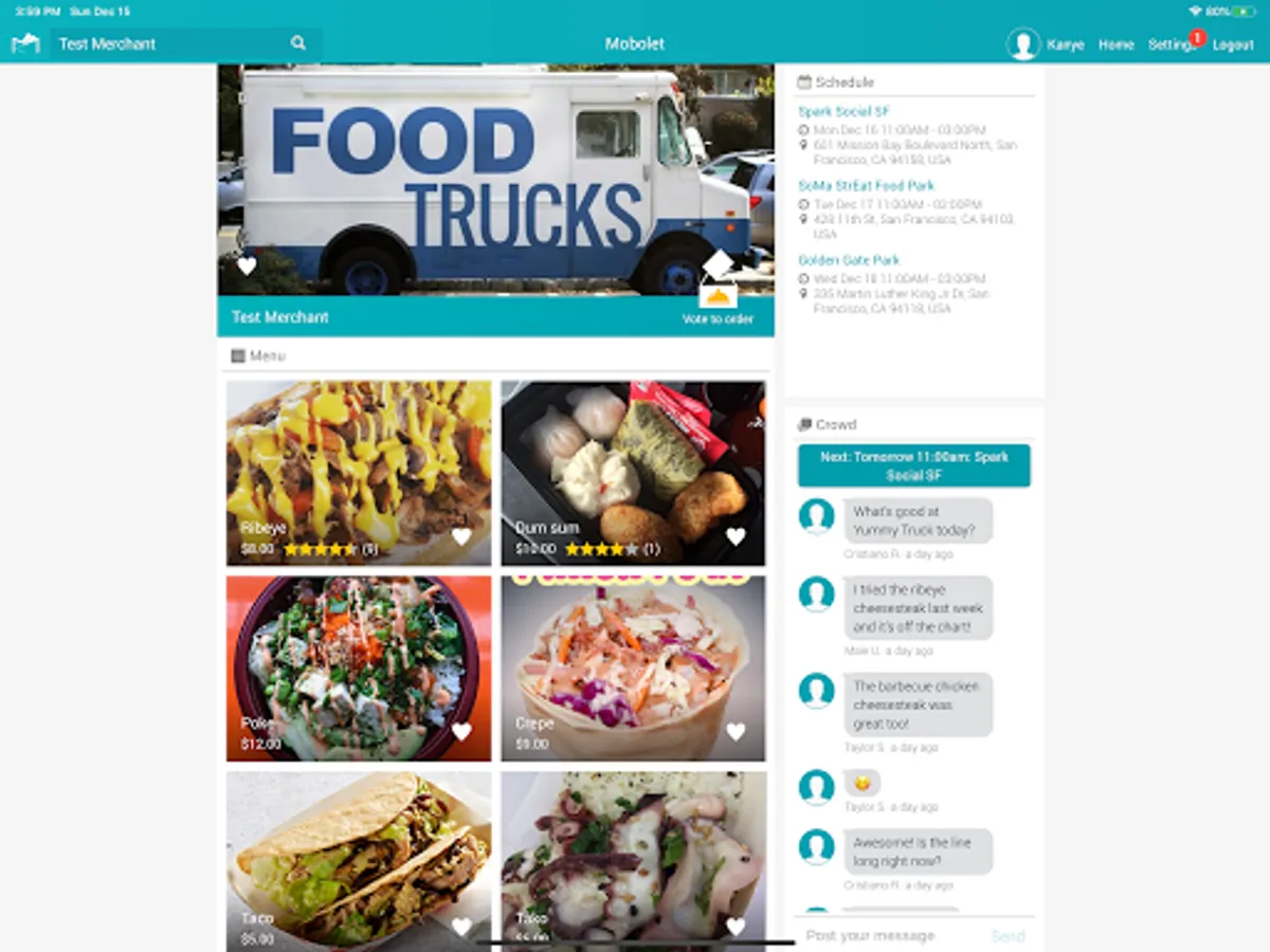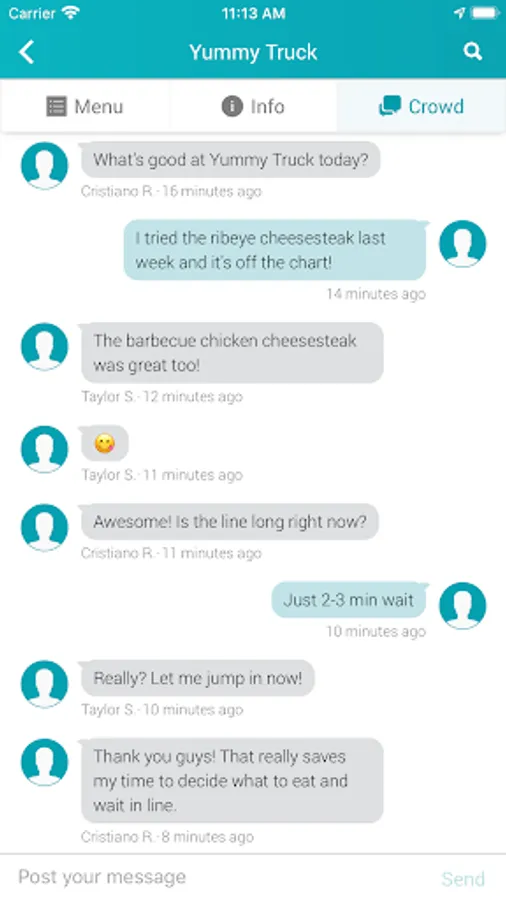 Customers can chat with the food truck patronizing crowd about the food, the service, and the surroundings. They can see the menu with photos and itemized reviews. They can also skip the line with pre-order and scheduled pickup.