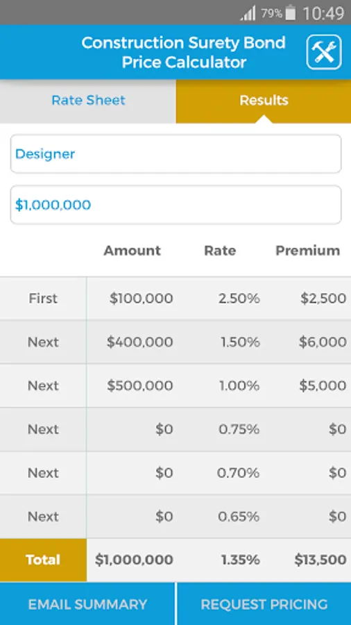 Now construction contractors and estimators can calculate the price of performance and payment bonds in seconds. With built-in sample contract surety bond rates, the Construction Surety Bond Price Calculator from Direct Surety helps ensure contractors never lose another bid due to incorrect surety bond pricing.
