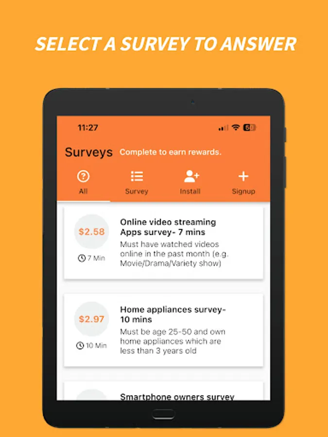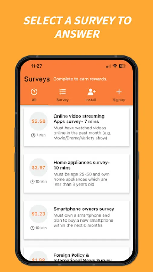 3. Select surveys you want to answer, based on how long they take and their reward