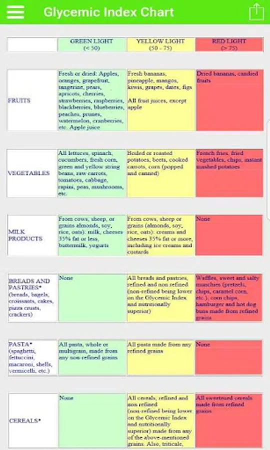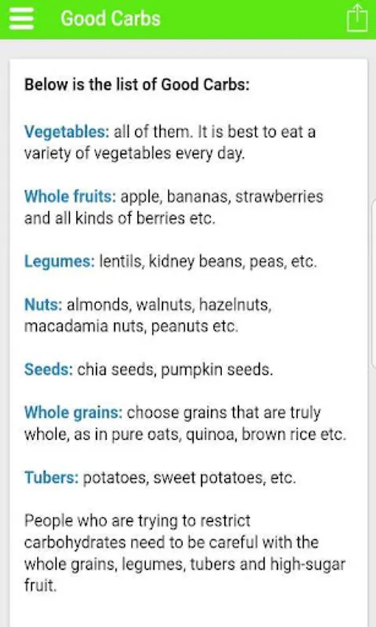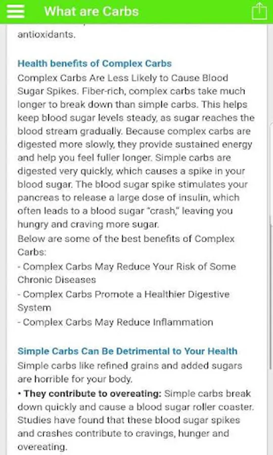 App talks about the types of carb - good and the bad carb, and how you can differentiate between what kind of carb you should have and what you should avoid. There is a section devoted on the app on Glycemic Index Chart, which will give you an indication of the suitability of consuming carb based diet.