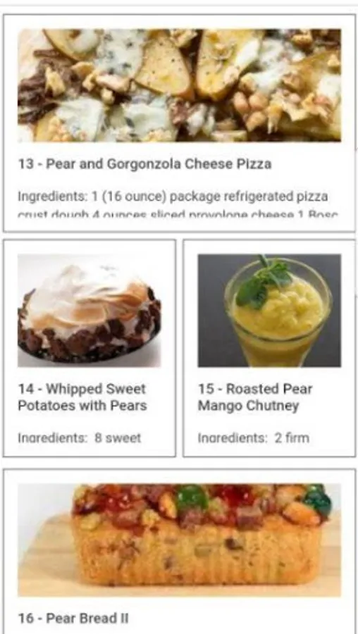 This application contains variety of recipes and pear recipe is one among them. Featured on today Show, here matches 178 pear recipes to your cooking lifestyle’s healthy, nutrient, diet, food allergies, and favourite cuisine.
