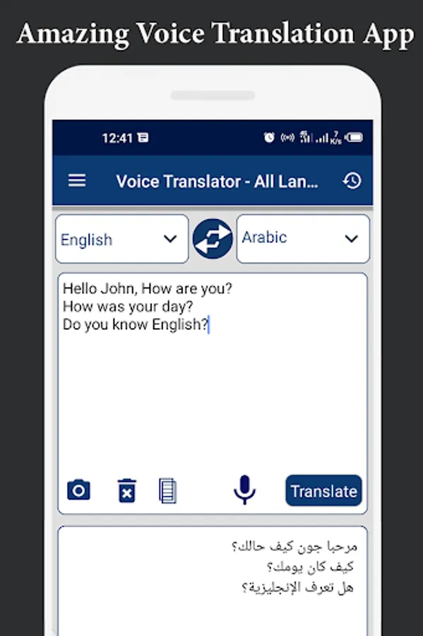 Voice Translator to Translate from English to Any desired language you are looking for to translate. As we know English the most speaking language in the world so here English is the main language that you can translate by using Voice Translator from this language to any other language. Voice Translator is easy to use and its UI is user friendly as well.