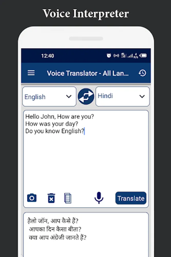 - Voice Translator has also supported Camera Translator as well you can translate through a picture as well, for that, you have to click a picture of the desired text you want to translate and then crop text in the image and then simply click on translate and here is your translation.