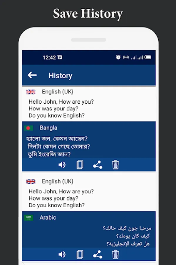 - Voice Translator is also saved you all translated history of all languages so you can check it back again when you want.