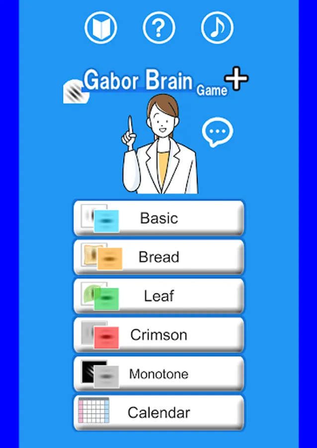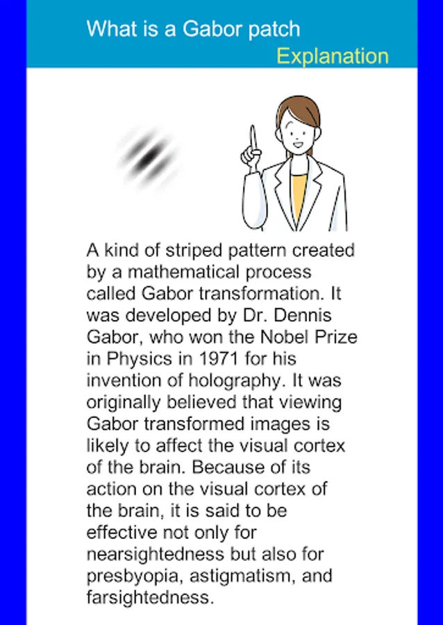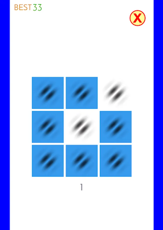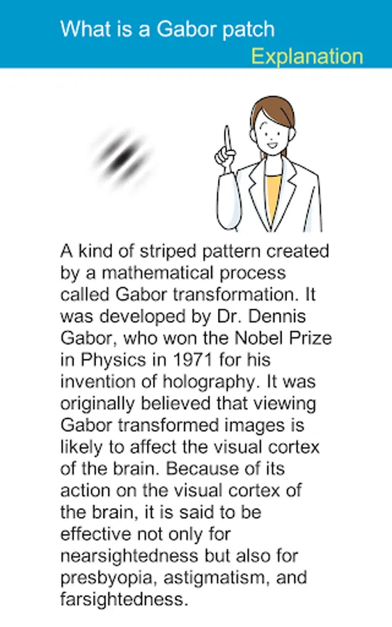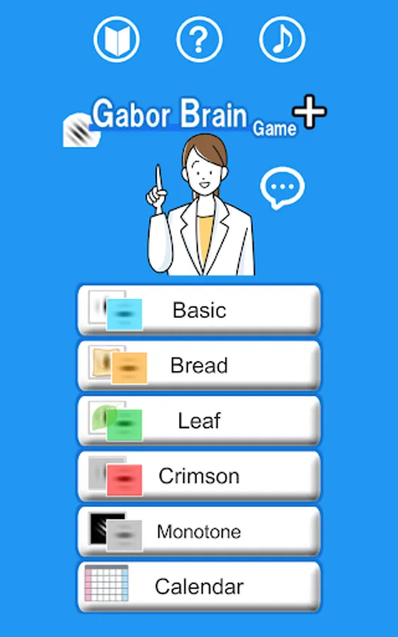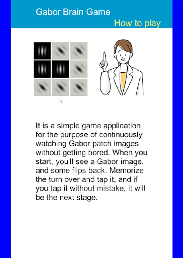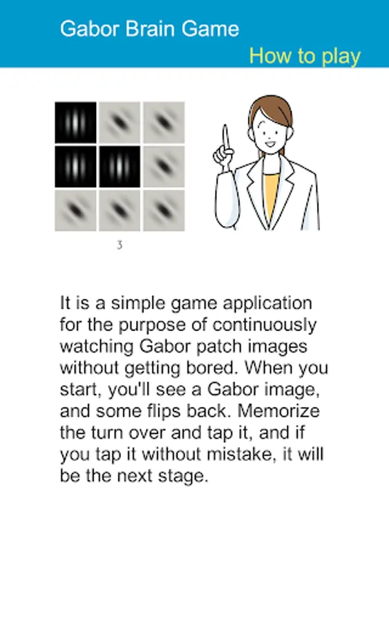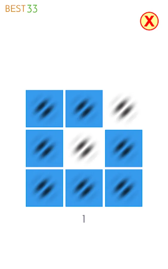 When you press the start button, the Gabor patch image is displayed. Shortly thereafter, several other Gabor images appear on top of it and disappear. Remember where the Gabor patch image disappeared and tap it. If you tap all the parts of the Gabor image that disappeared, the next screen will appear. Each time you erase one, the score will be added. If you make a mistake, it's over, but you can try again and again. There are currently 5 categories, so you can choose and challenge your favorite category every day. (Categories and images will be added regularly)