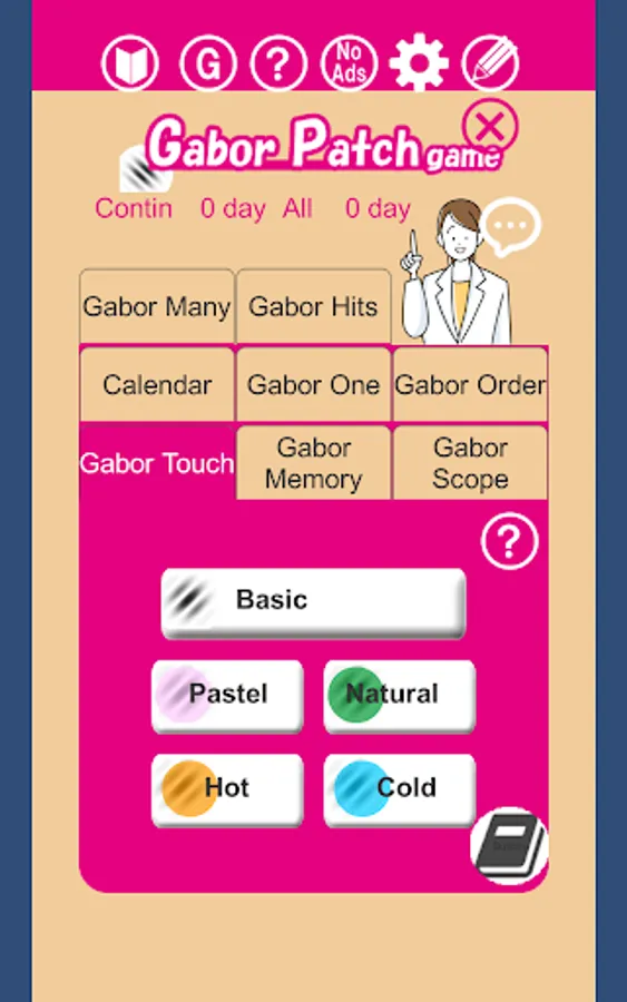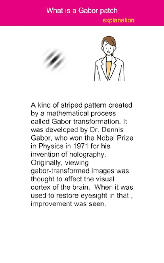 This app is a simple game app aimed at continuously watching Gabor Patch images without getting bored.
