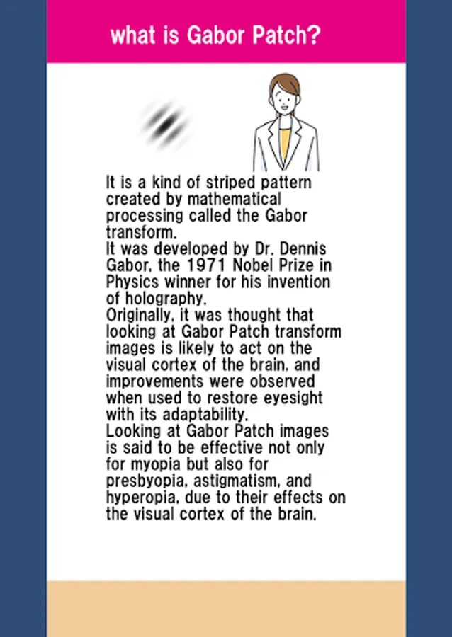 Looking at Gabor Patch images is said to be effective not only for myopia but also for presbyopia, astigmatism, and hyperopia, due to their effects on the visual cortex of the brain.