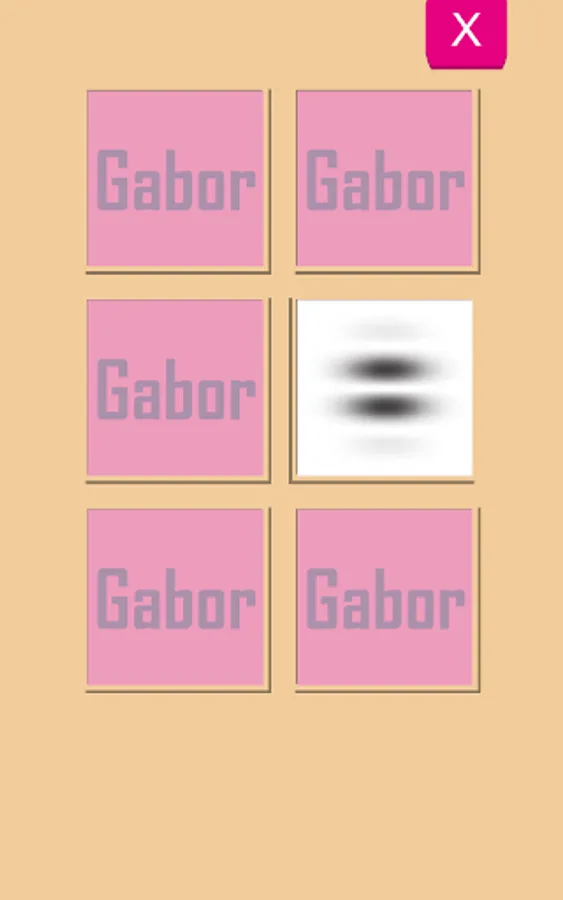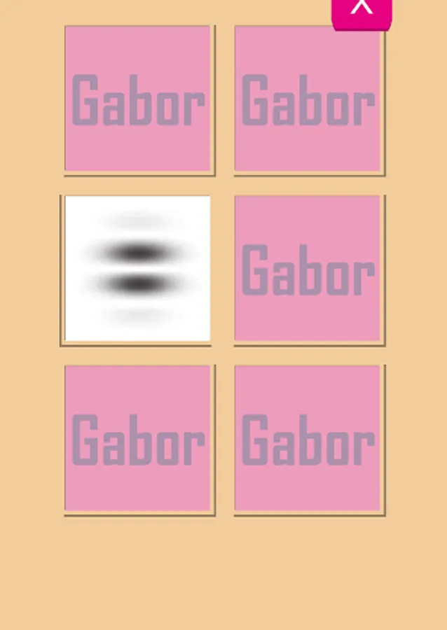 It is a Concentration game using Gabor patch image.Tap to flip two cards. If it is the same Gabor Patch image, it will disappear.When all disappear, you can move on to the next level.