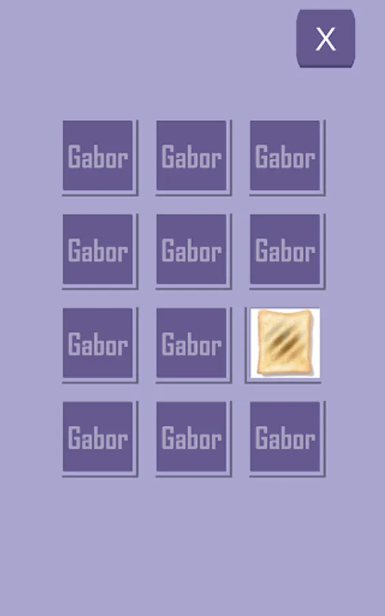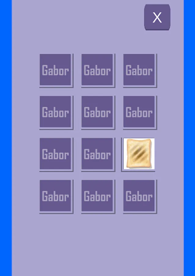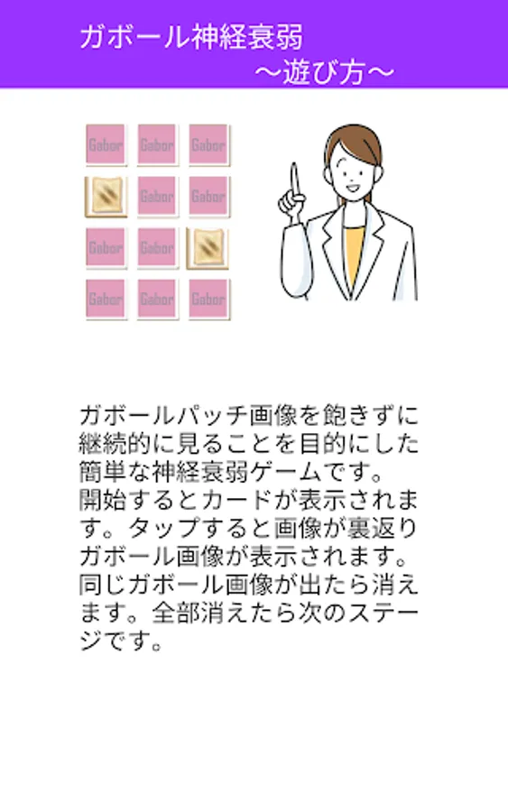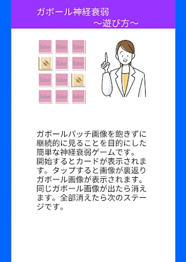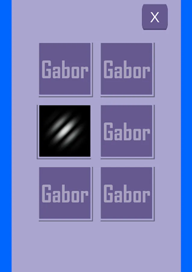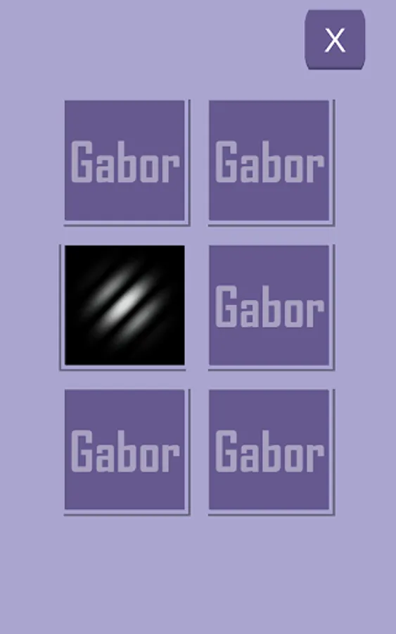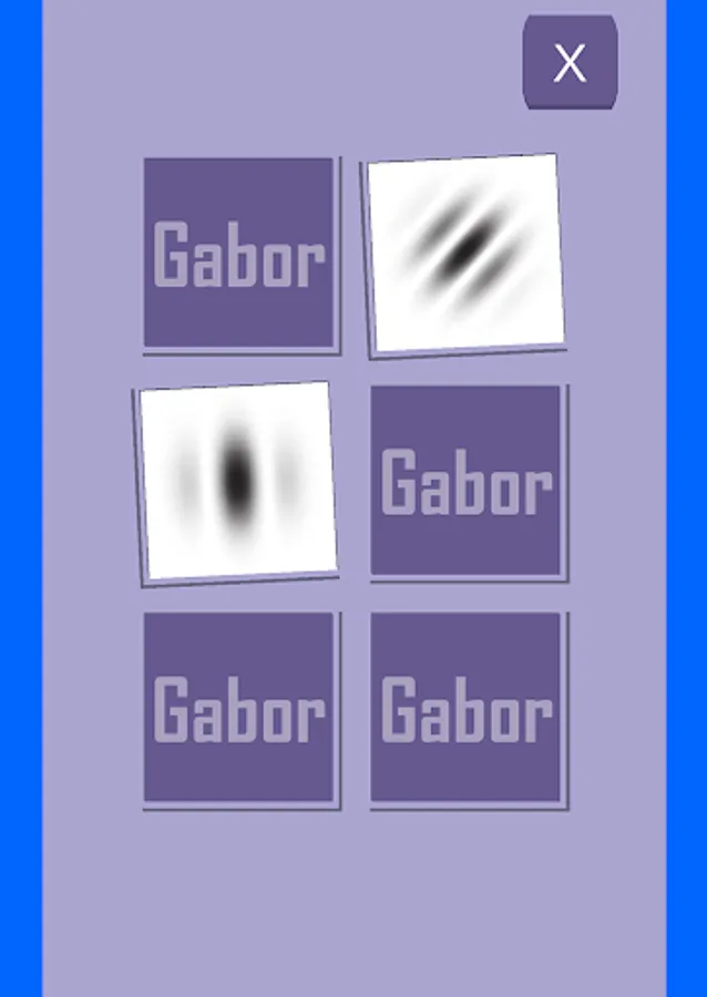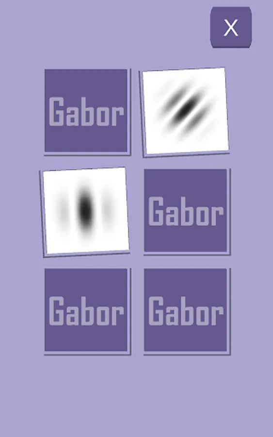 It is a simple nervous breakdown game that aims to continuously see Gabor patch images without getting bored. A card will appear when you start. When you tap it, the image flips over and the Gabor image is displayed. If the same Gabor image appears, it will disappear. When all are gone, it's the next stage.
