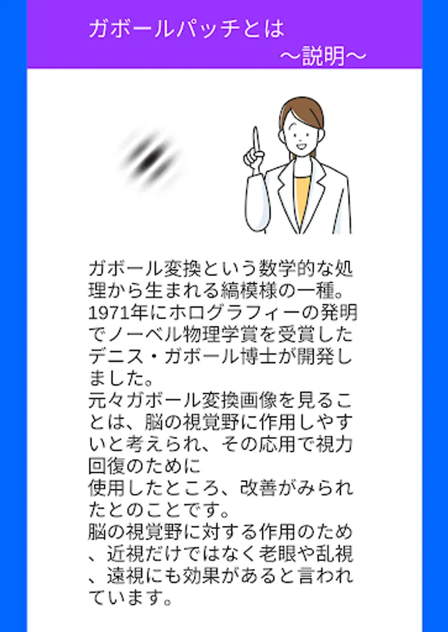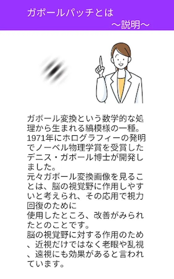 A kind of striped pattern created by a mathematical process called Gabor transformation. It was developed by Dr. Dennis Gabor, who won the Nobel Prize in Physics in 1971 for his invention of holography. It was originally believed that viewing Gabor transformed images is likely to affect the visual cortex of the brain. Because of its action on the visual cortex of the brain, it is said to be effective not only for nearsightedness but also for presbyopia, astigmatism, and farsightedness.