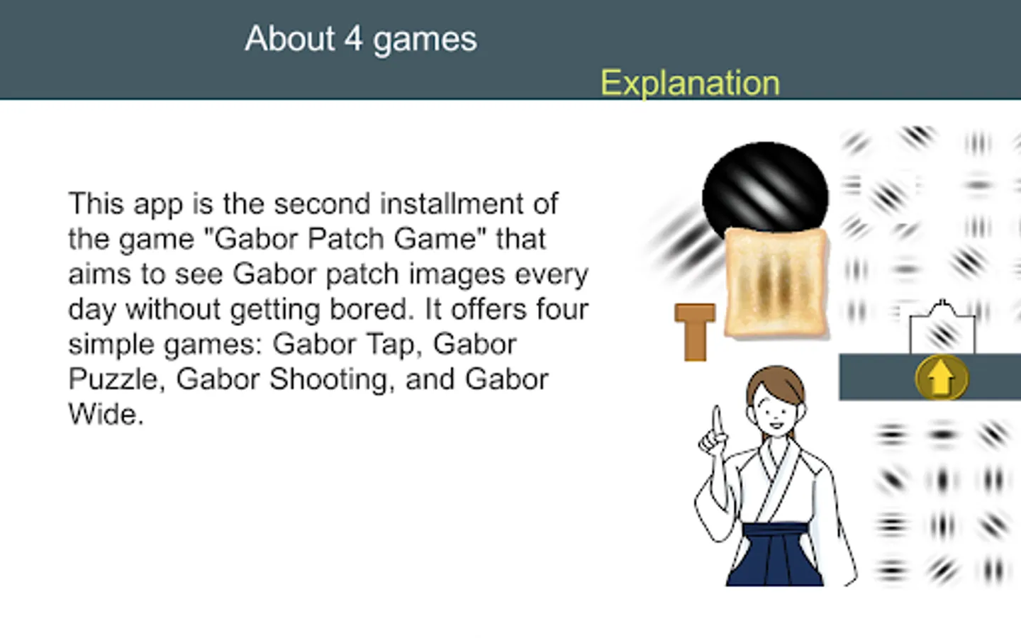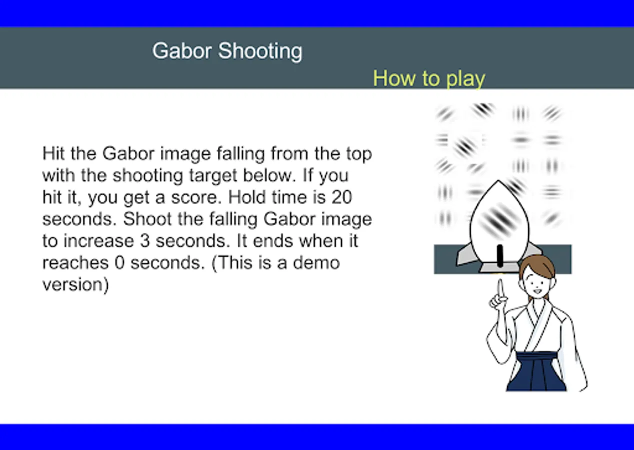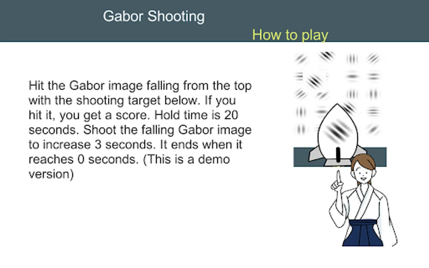 Hit the Gabor image falling from the top with the shooting target below. If you hit it, you get a score. Hold time is 20 seconds. Shoot the falling Gabor image to increase 3 seconds. It ends when it reaches 0 seconds. (This is a demo version)