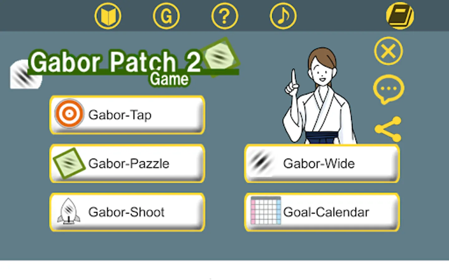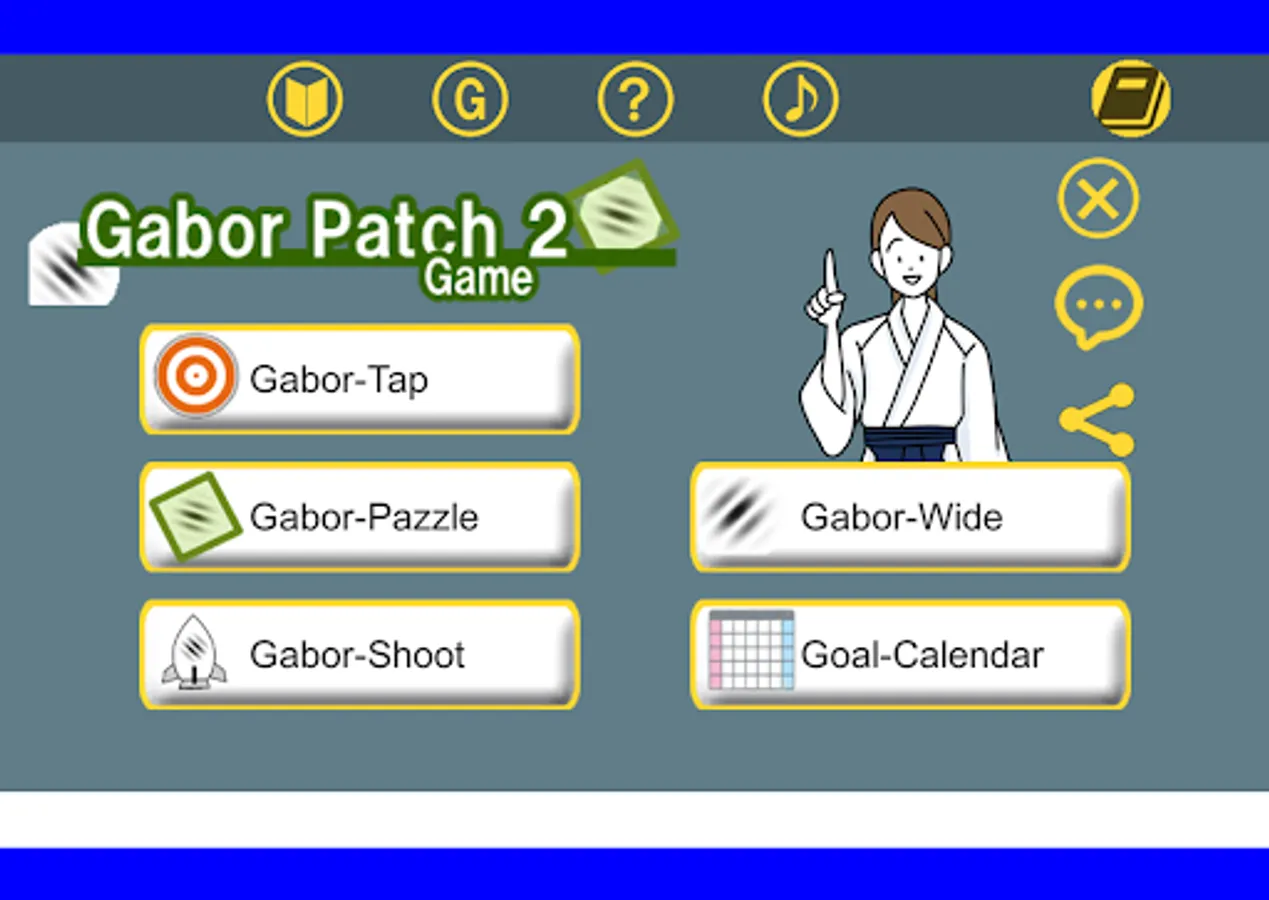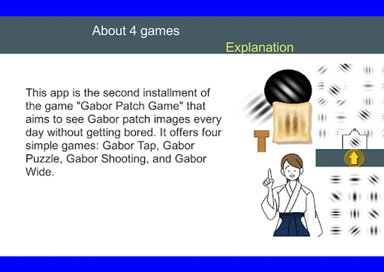 Hit the Gabor image falling from the top with the shooting target below. If you hit it, you get a score. Hold time is 20 seconds. Shoot the falling Gabor image to increase 3 seconds. It ends when it reaches 0 seconds. (This is a demo version)