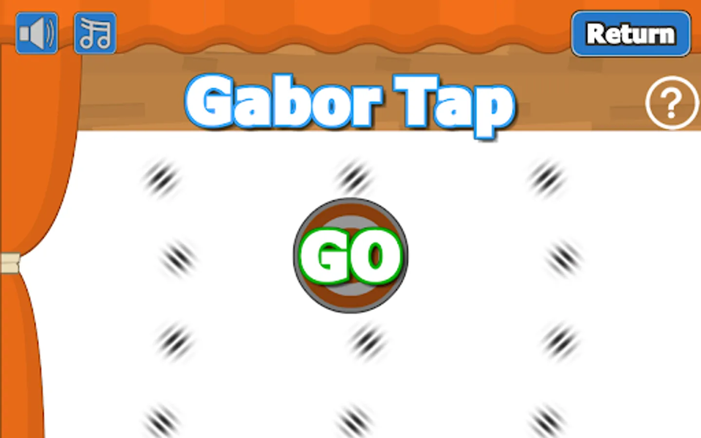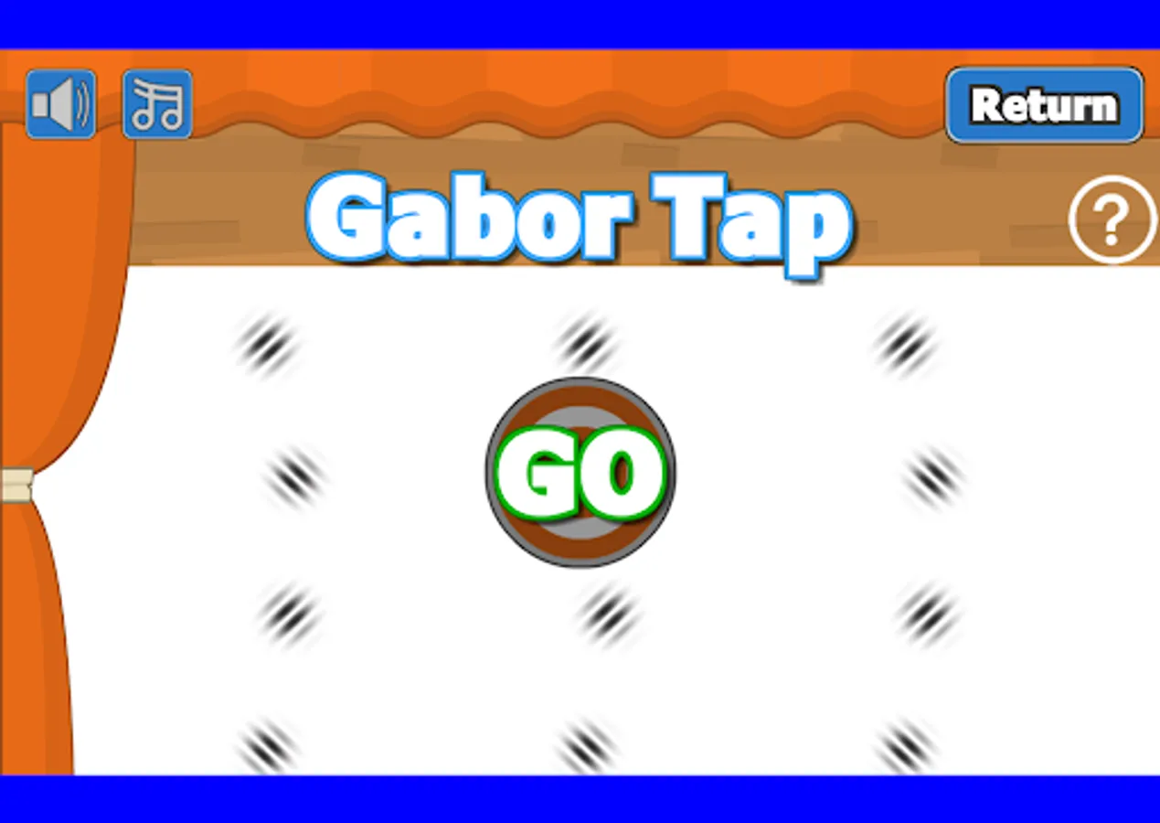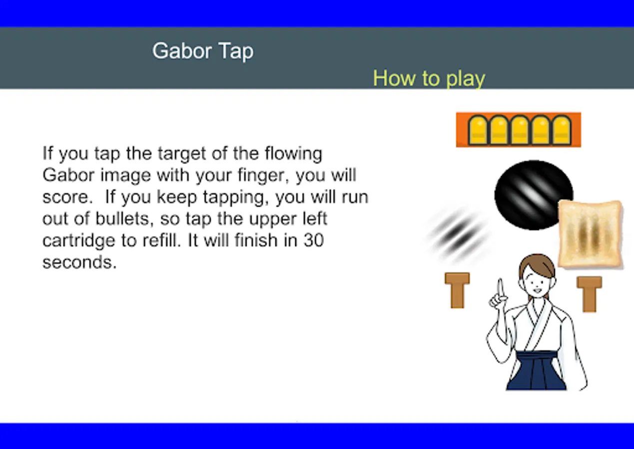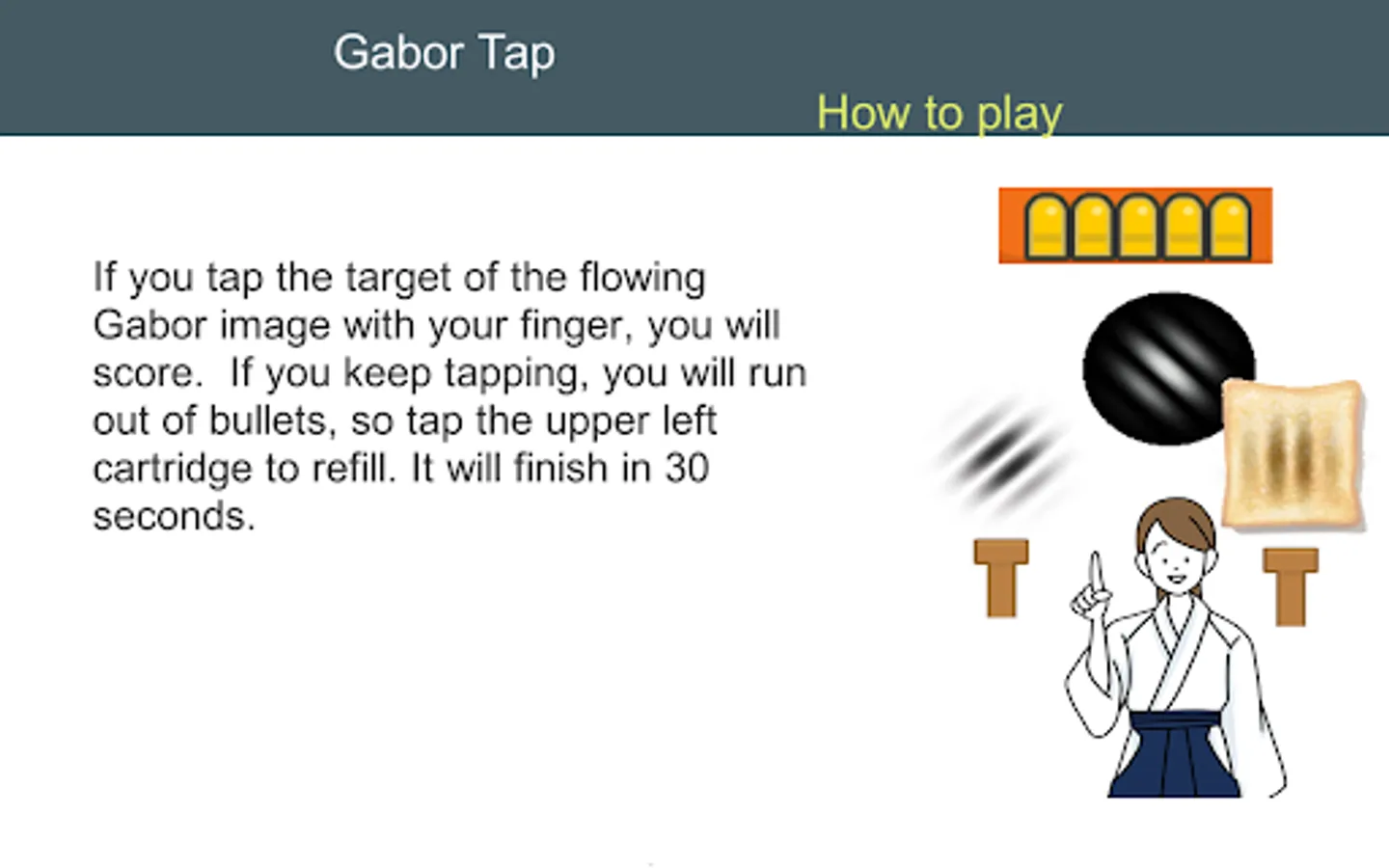 If you tap the target of the flowing Gabor image with your finger, you will score. If you keep tapping, you will run out of bullets, so tap the upper left cartridge to refill. It will finish in 30 seconds.