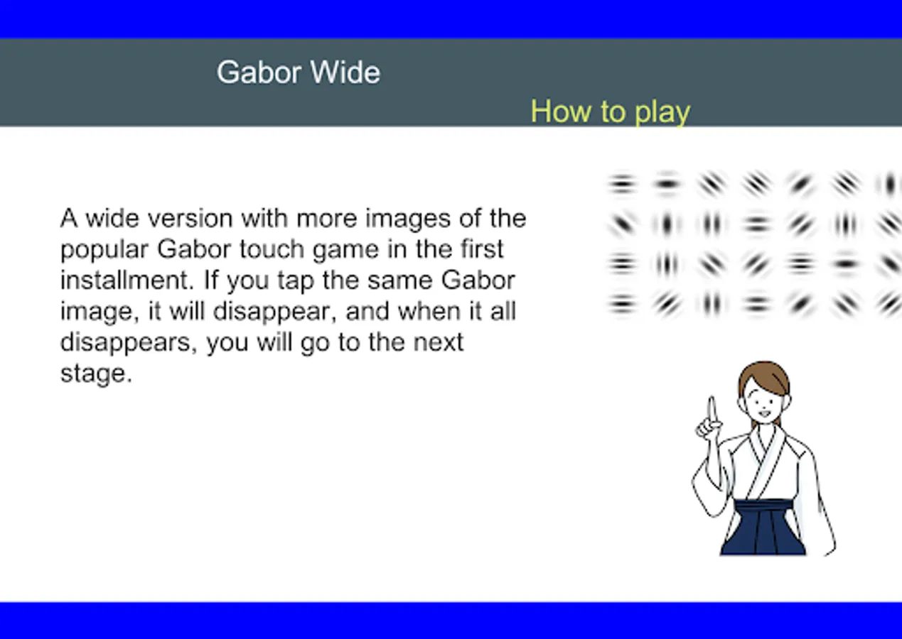 A wide version with more images of the popular Gabor touch game in the first installment. If you tap the same Gabor image, it will disappear, and when it all disappears, you will go to the next stage.