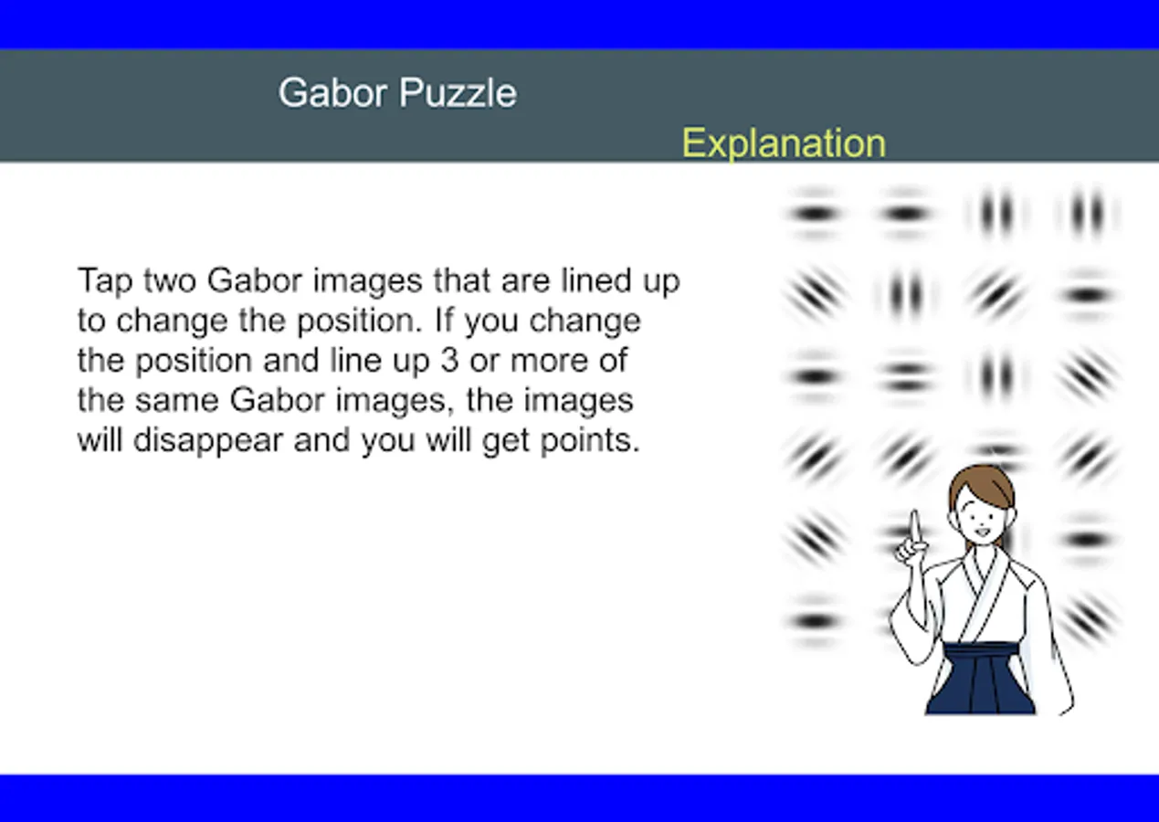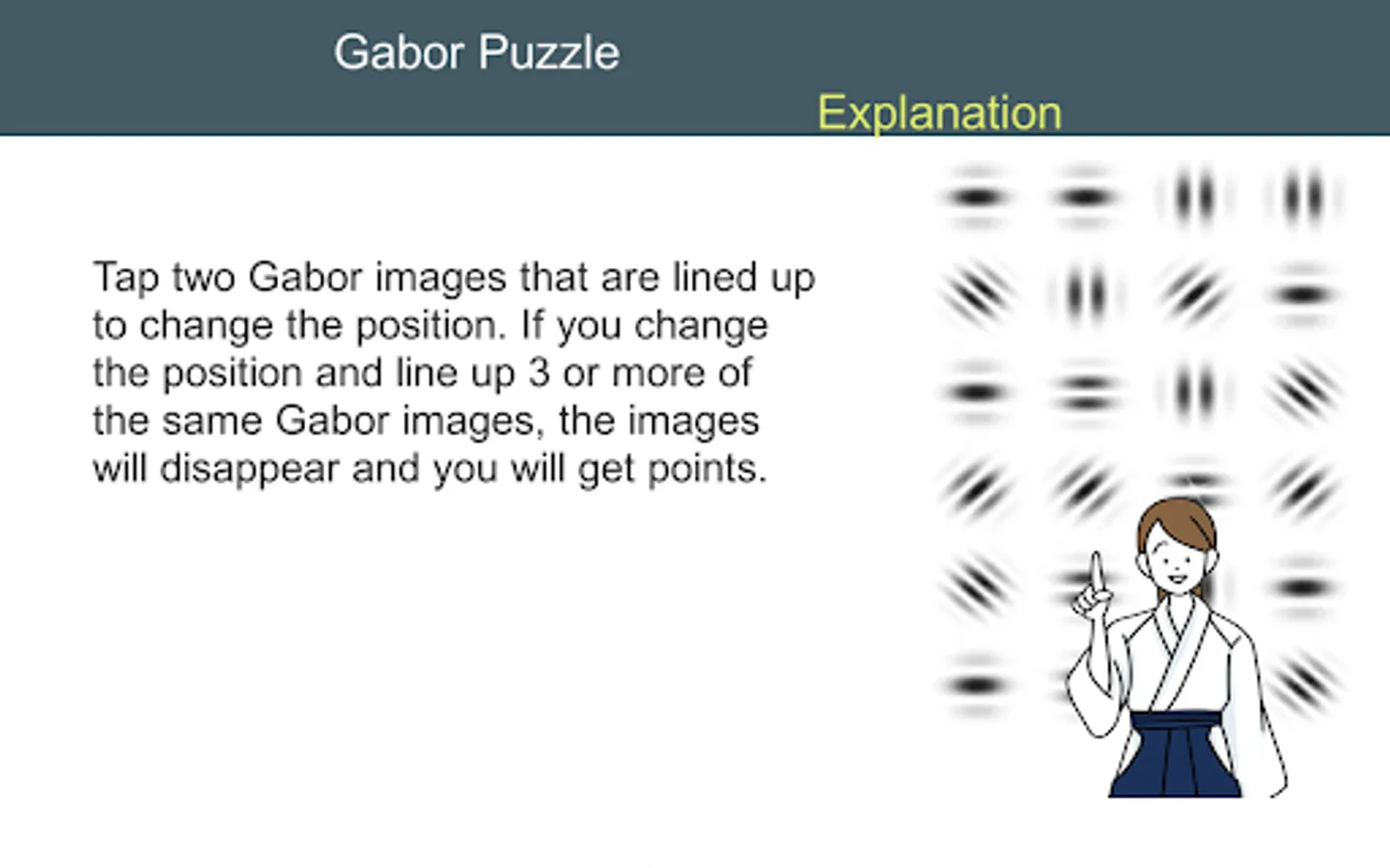 Tap two Gabor images that are lined up to change the position. If you change the position and line up 3 or more of the same Gabor images, the images will disappear and you will get points.