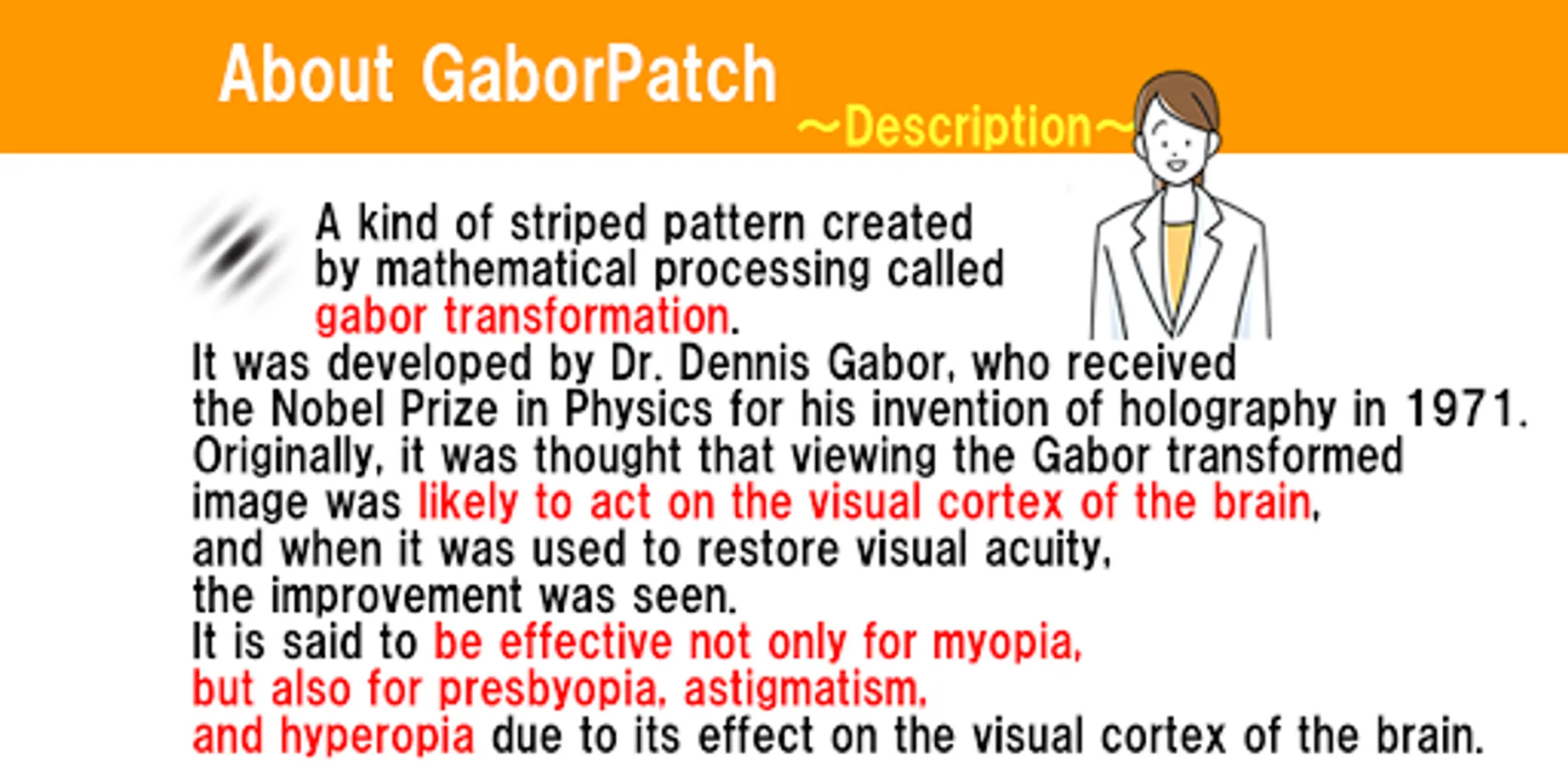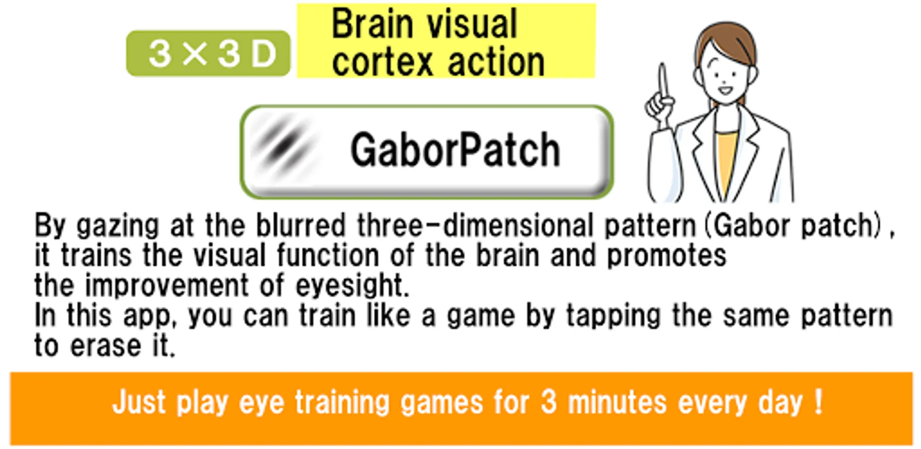 It is a training performed using an image called Gabor transform. Blurred 3D Gabor-transformed images are thought to easily act on the visual cortex of the brain, and their application is used for vision recovery training.