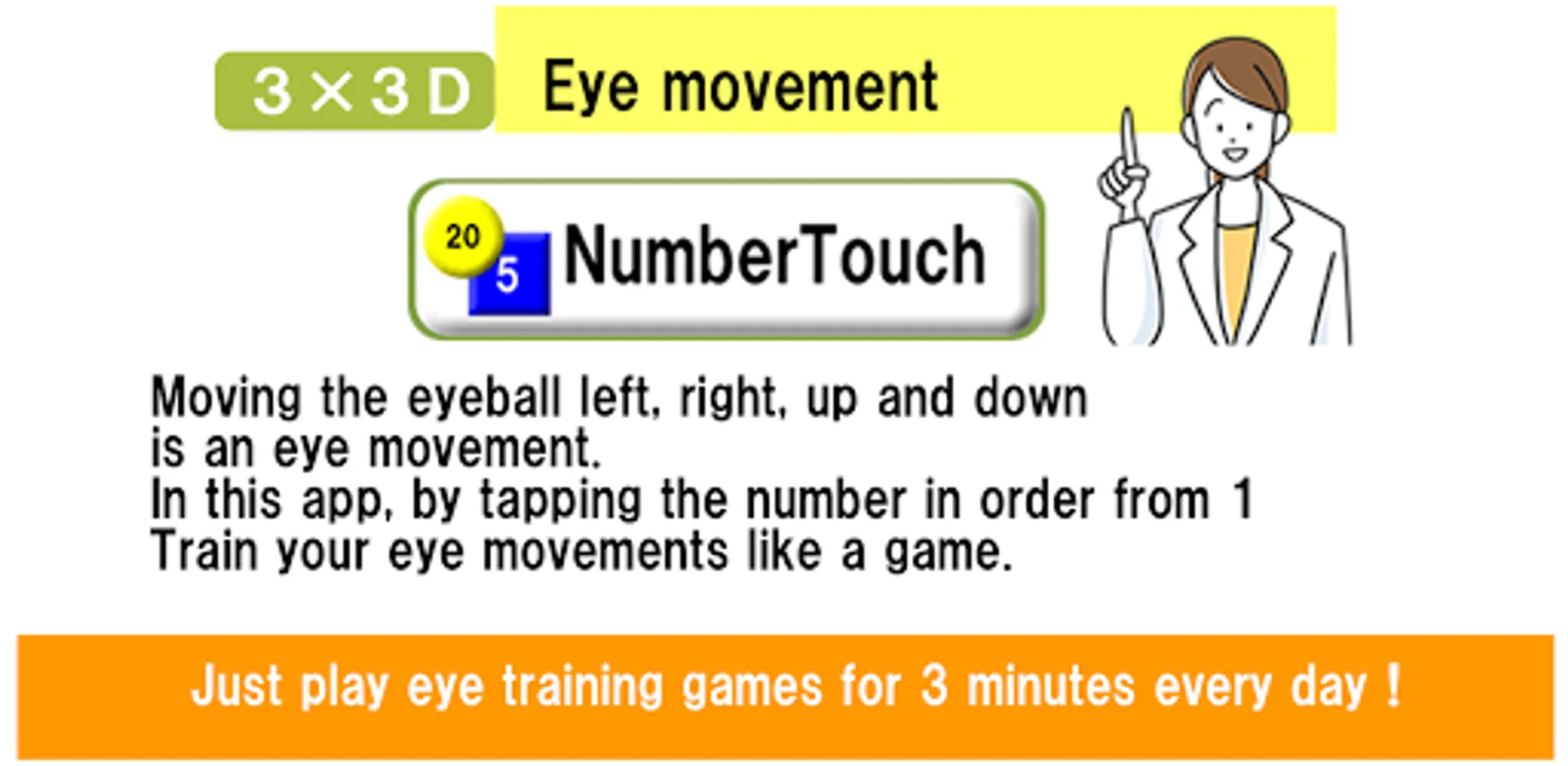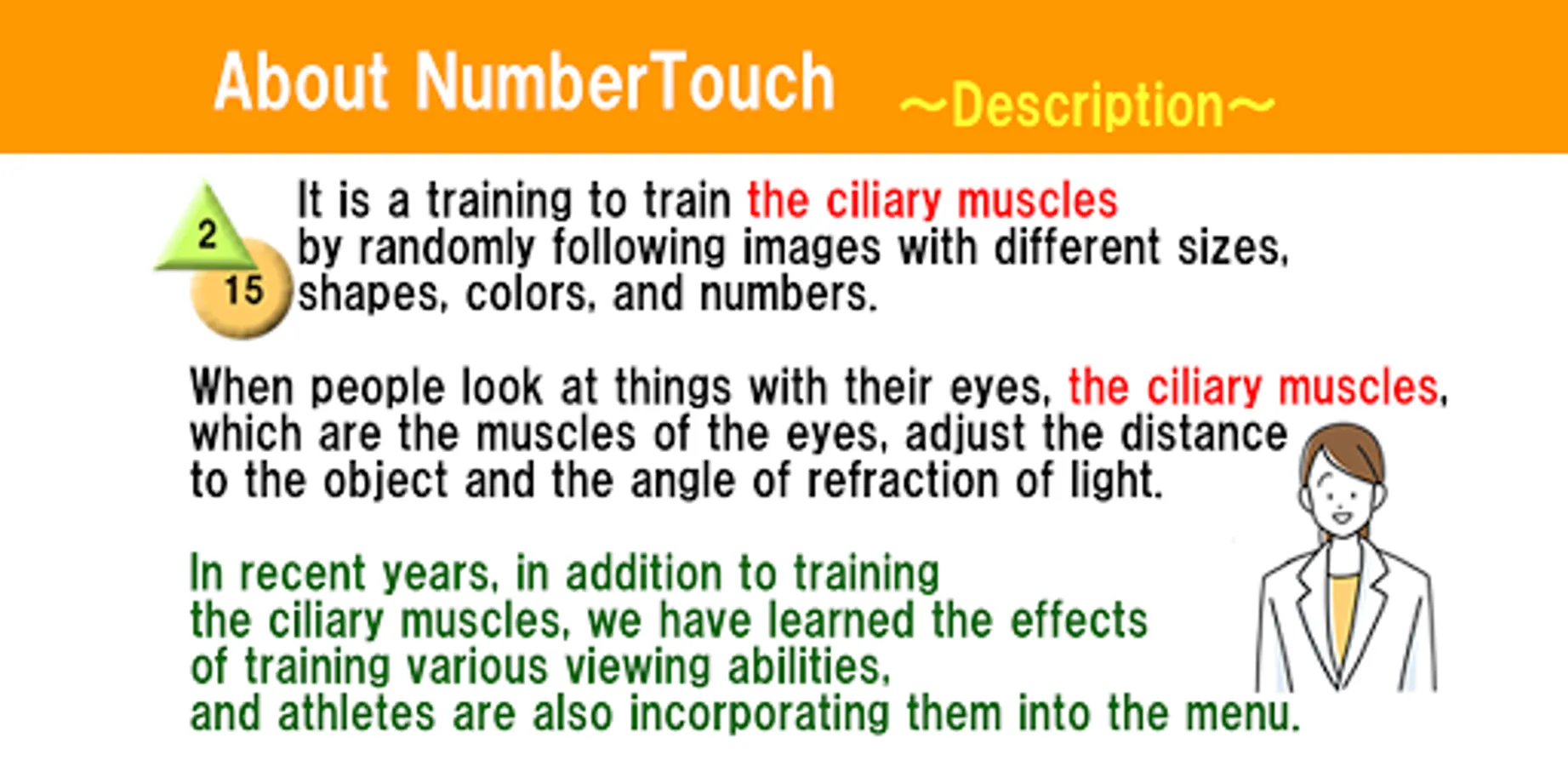 It is a training to train the ciliary muscles by randomly following images with different sizes, shapes, colors, and numbers. When a person sees things with his eyes, the ciliary muscle, which is the muscle of the eye, adjusts the distance to the object and the angle of refraction of light, and the ciliary muscle is trained by number touch training.