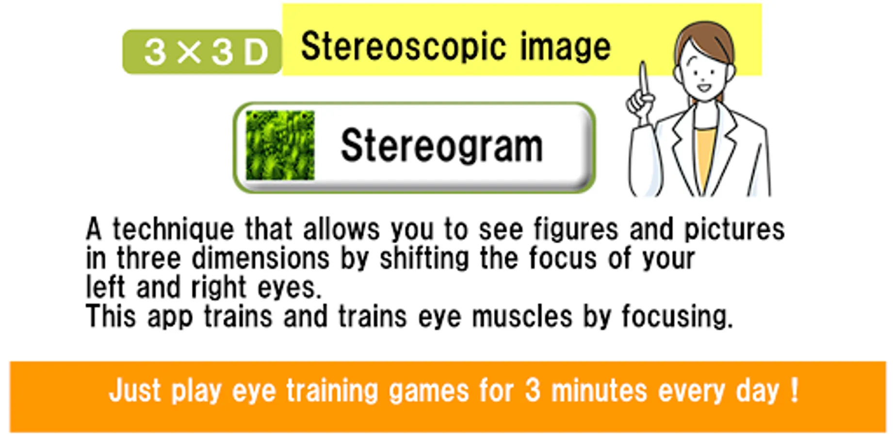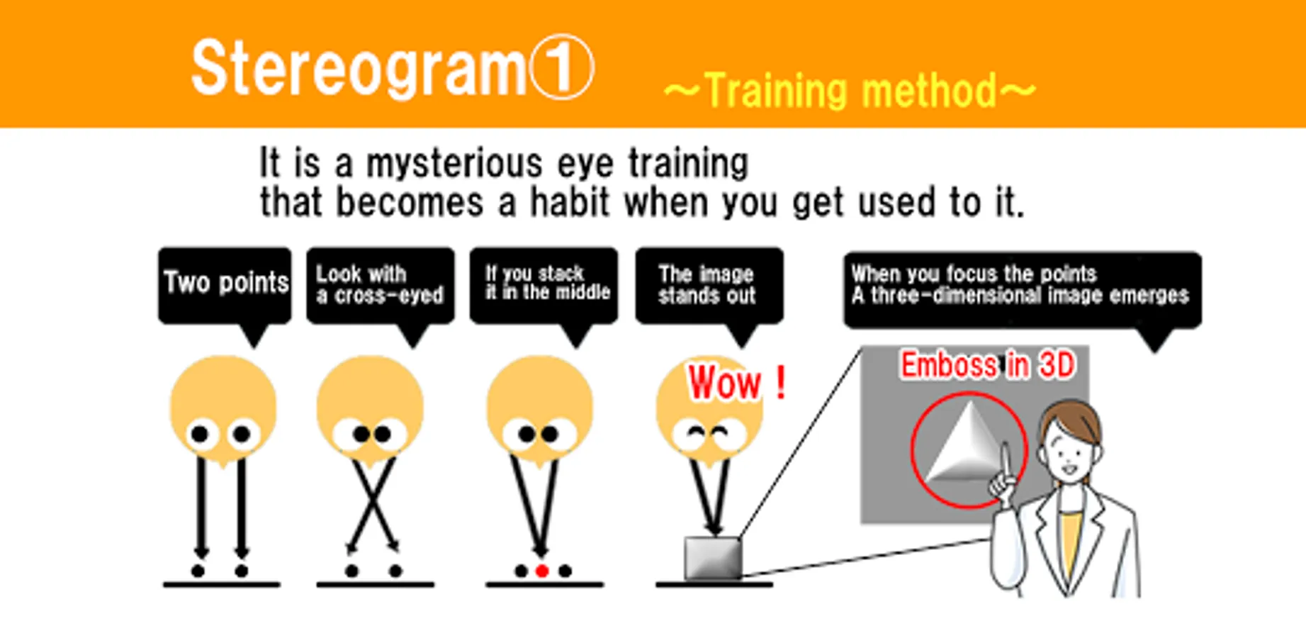 It is a training to see the image by the parallel method and the cross method of 3D stereogram. By consciously looking at the 3D image while focusing on it, you will train your eyesight in the brain, and the work will train the muscles of the eyes that you do not normally use. It can also be a stretch of.