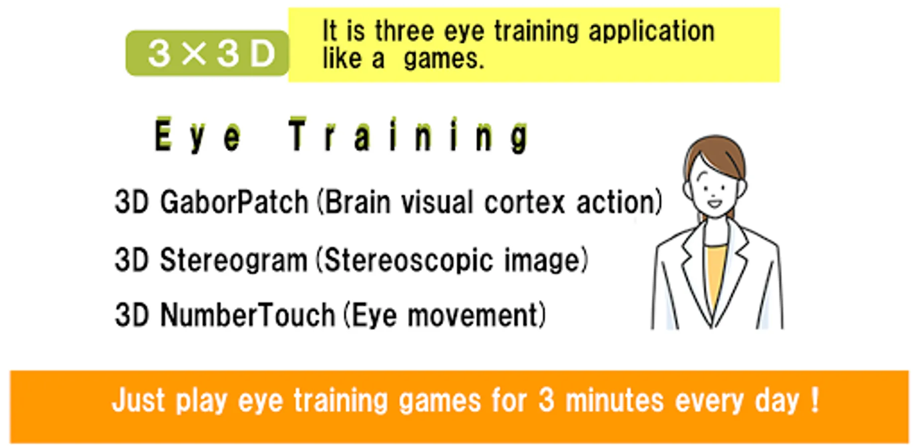Three 3D stereoscopic trainings to train eye movements, eye muscle movements, and intracerebral visual acuity. This app allows you to enjoy 3D stereoscopic training as if you were playing a game, so you can continue it every day.