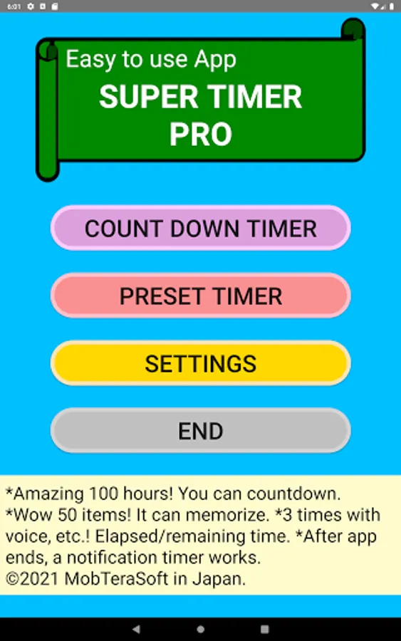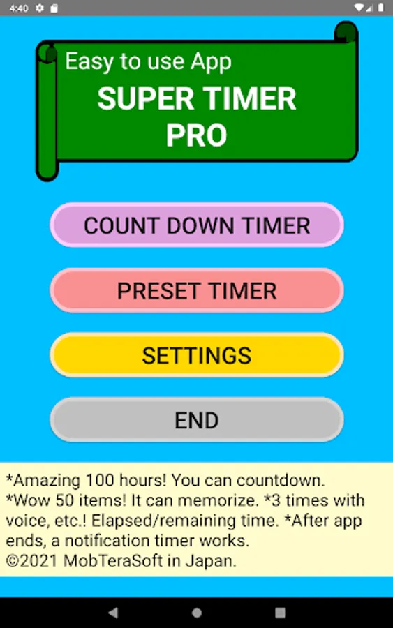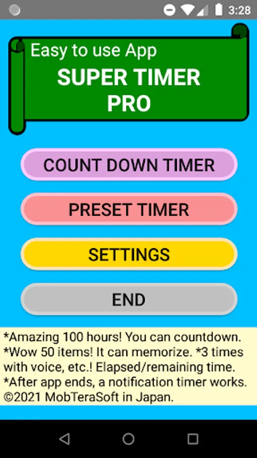 "Super timer pro" will let you know the time with human voice. If the human voice is embarrassing to the surroundings, you can use ringtone. When you cannot use voice or sound, you can use vibration. Please use it the way you like.